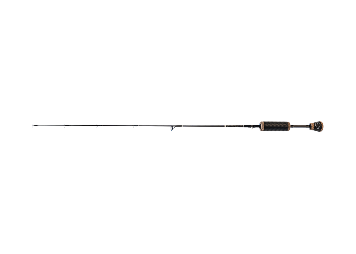 The 28” Black Reign is geared towards the in-the-shack angler that’s looking for a little extra power or getting into some heavier baits. The fast action, solid carbon fiber, medium blank really drives the hooks home in a low profile package. Assembled with cold weather (-30 rated) rebounding titanium guides, and a 6” full or split Sure-Grip handle.