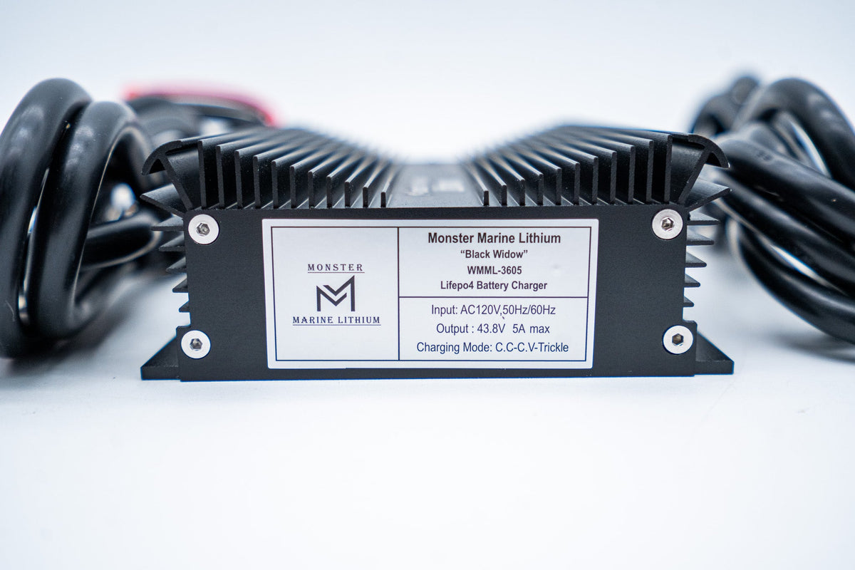 This advanced marine waterproof battery charger is slim and lightweight. It can be mounted anywhere and is designed to charge 36V Monster Marine Lithium batteries!
