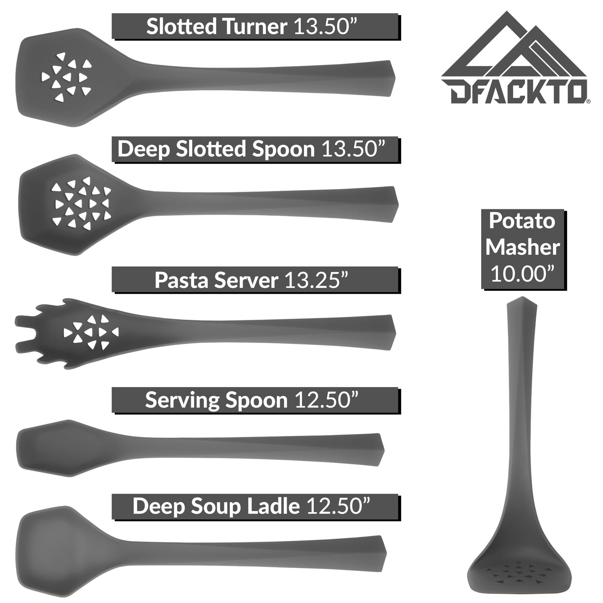 - EXTREME DURABILITY TO LAST FOR YEARS: Our heavy-duty nylon construction looks great and ensures long term performance. DFACKTO kitchen utensils will not melt or bend.