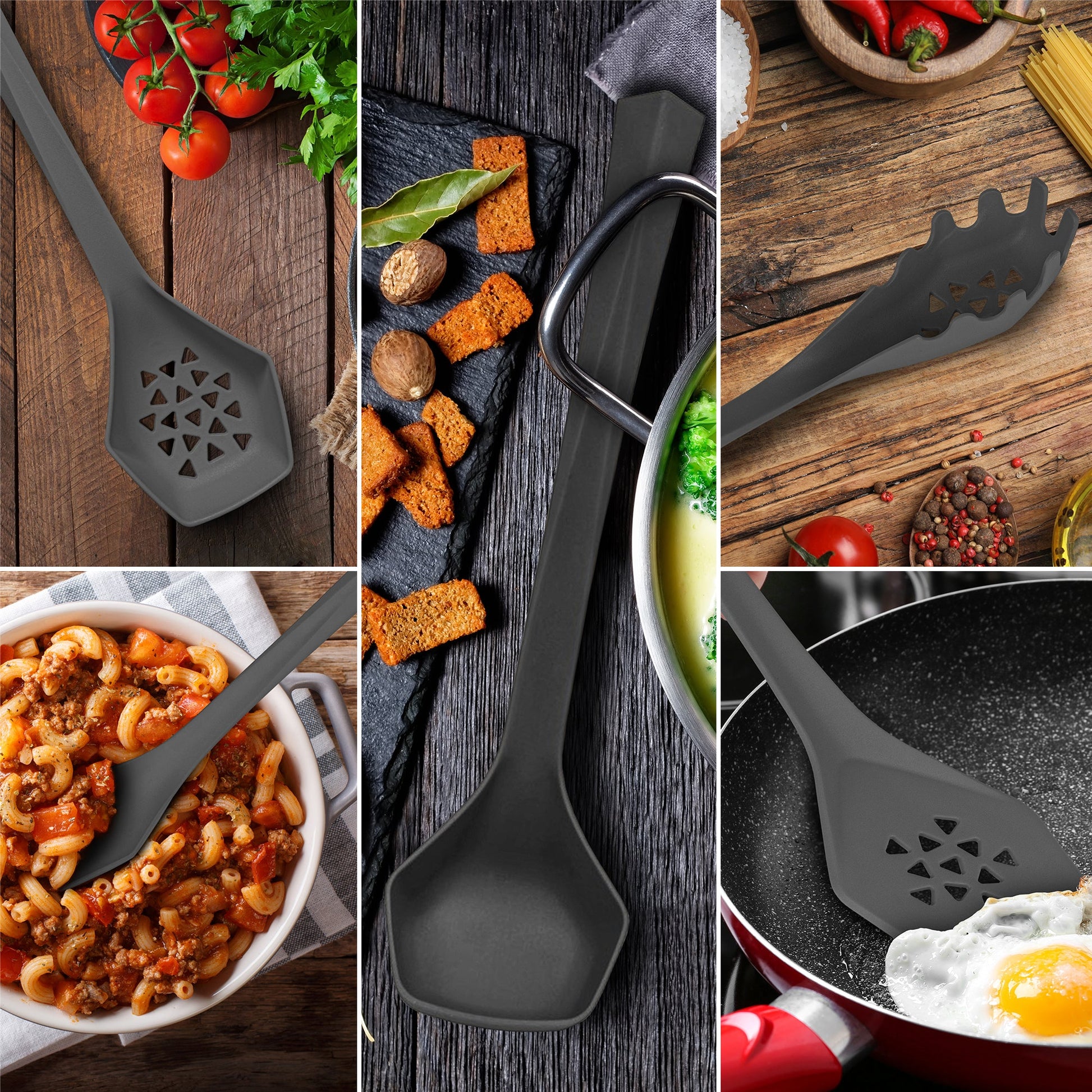 - HEAVY DUTY 6 PIECE COOK’S SET: The set includes 2 Spatulas, Slotted Spoon, Pasta Fork/Strainer, Serving Spoon, and Soup Spoon.