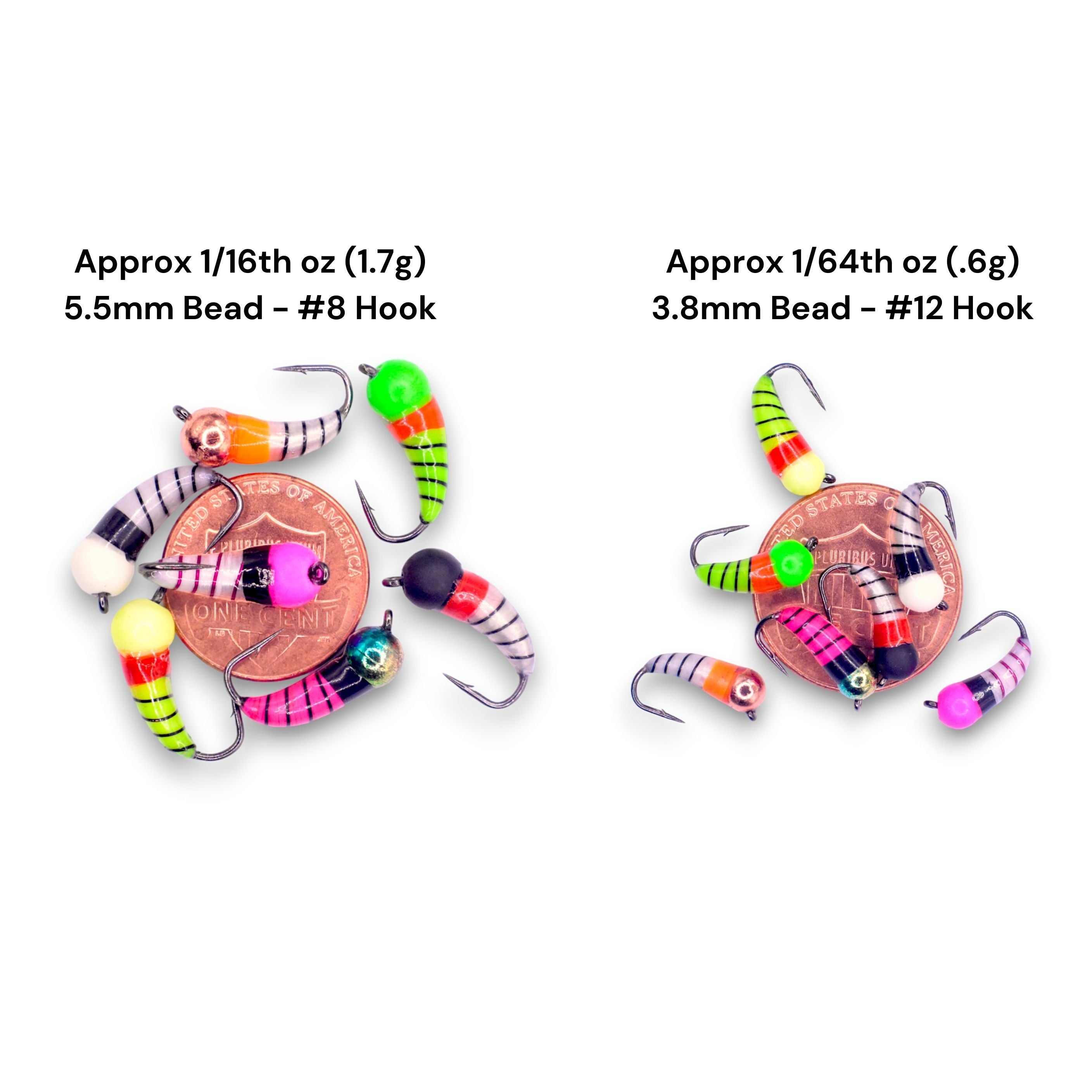 - Approx 1/64th oz (.6g) 3.8mm Bead - #12 Hook (7 Pack/1 of each color)