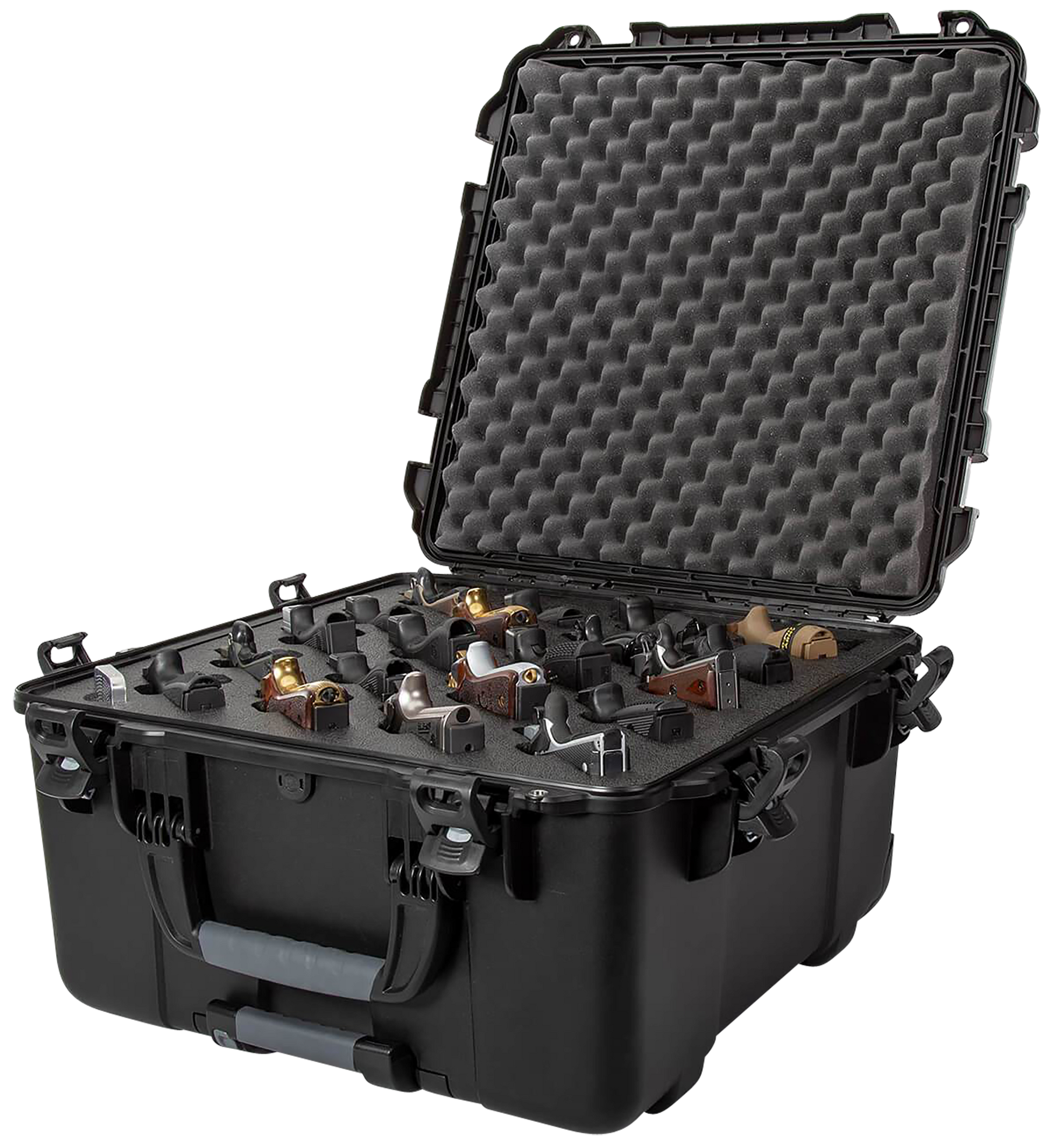 The nanuk 968 20 up pistol case provides secure storage for up to 20 full-frame handguns with trigger locks and 20 magazines. This hard case fits all pistols with barrel lengths up to 5", and meets the storage standards and regulations for firearms. The nanuk 968 20 up pistol case has a lifetime guarantee and is waterproof, dustproof and indestructible. It will also accept 1911 style handguns and accommodate the weapons with their trigger locks in place. Magazines are stored side-by-side either single or double stacked. With two (2) reinforced eyelets to accommodate locks, you can organize, protect and carry your handguns with confidence. Our smooth ball-bearing-sealed polyurethane wheels and our 2-stage retractable handle makes transportation easy and convenient. A tsa retro-fit latch kit is easy to install and adds an extra measure of security when traveling. This case features semi-rigid and highly-resistant, closed cell synergy pef foam for long term performance.