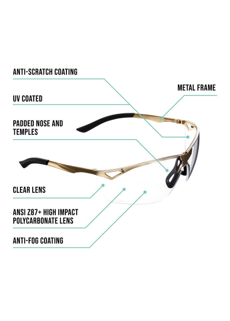 - IMPACT RESISTANT SAFETY GLASSES: Made with high impact polycarbonate, durable metal frame has soft nose pieces & ear pads for comfort—safety glasses are ANSI Z87+ & CE rated.