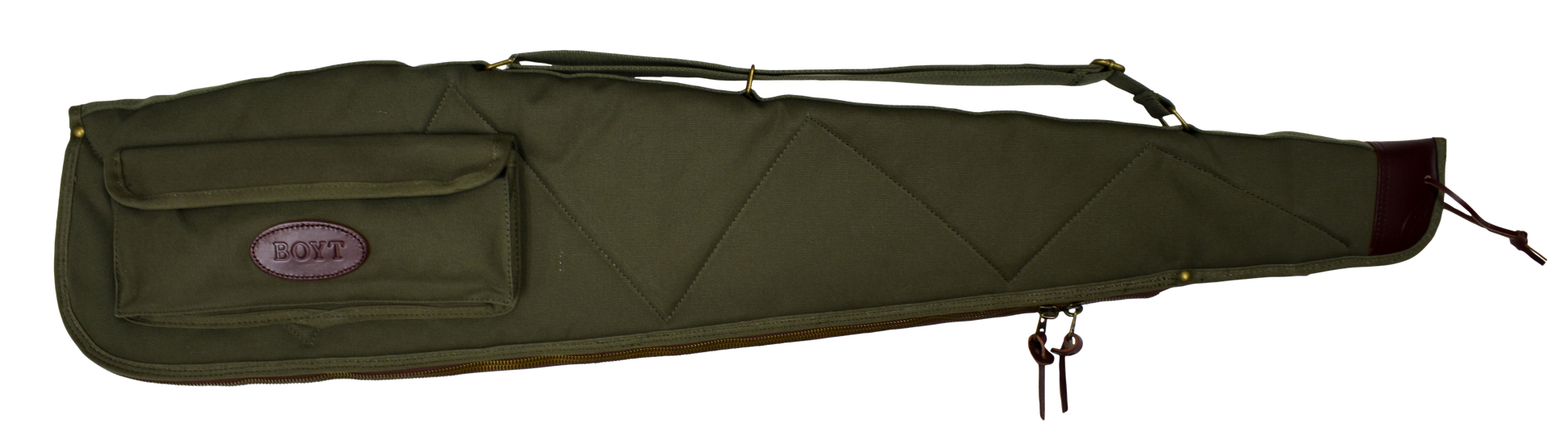 Boyt's alaskan rifle case features a waxed canvas shell with flannel lining, breathable non-compressible batting and brass hardware. It utilizes #10 brass zipper, lockable, double zipper pulls, heavy-duty web sling and spine, and has an accessory pocket (10"x4.5") with elastic loops for choke tubes.
