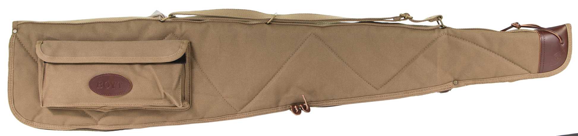 Boyt's alaskan rifle case features a waxed canvas shell with flannel lining, breathable non-compressible batting and brass hardware. It utilizes #10 brass zipper, lockable, double zipper pulls, heavy-duty web sling and spine, and has an accessory pocket (10"x4.5") with elastic loops for choke tubes.