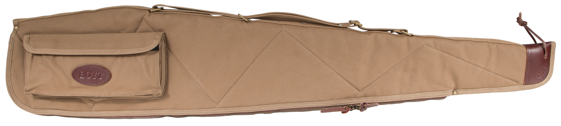 Boyt's alaskan rifle case features a waxed canvas shell with flannel lining, breathable non-compressible batting and brass hardware. It utilizes #10 brass zipper, lockable, double zipper pulls, heavy-duty web sling and spine, and has an accessory pocket (10"x4.5") with elastic loops for choke tubes.