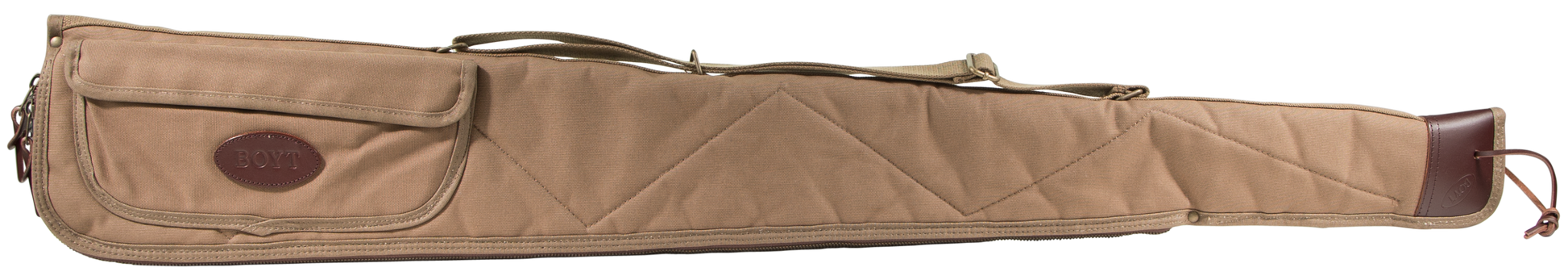 Boyt's alaskan shotgun case features a waxed canvas shell with flannel lining, breathable non-compressible batting and brass hardware. It utilizes #10 brass zipper, lockable, double zipper pulls, heavy-duty web sling and spine and has an accessory pocket (10" x 4.5") with elastic loops for choke tubes.