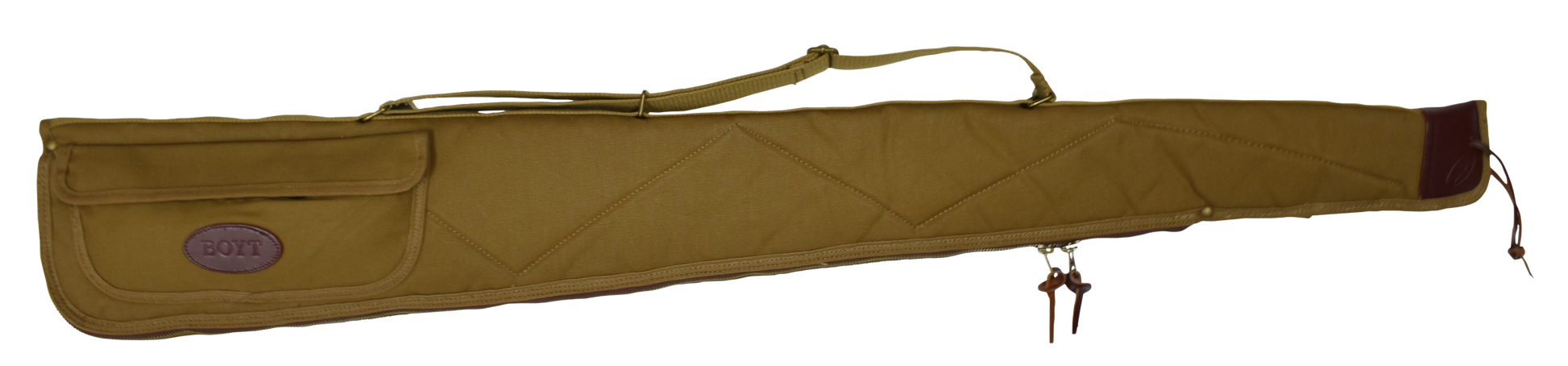 Boyt's alaskan shotgun case features a waxed canvas shell with flannel lining, breathable non-compressible batting and brass hardware. It utilizes #10 brass zipper, lockable, double zipper pulls, heavy-duty web sling and spine and has an accessory pocket (10" x 4.5") with elastic loops for choke tubes.