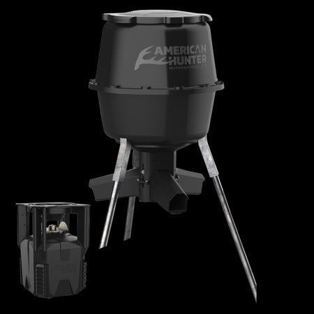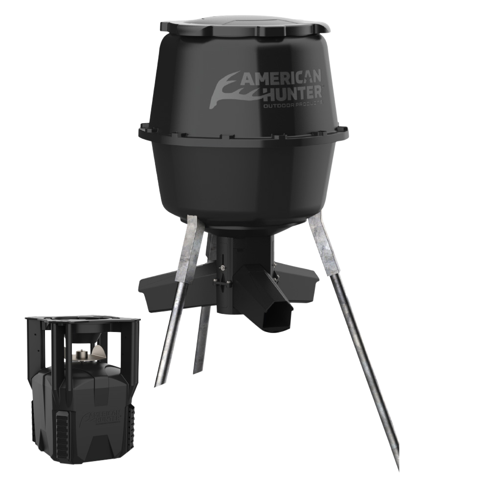 The xde-pro with hopper feeder features an ez-touch digital timer with large lcd display.The feeder has a simple spin plate, two q-set preconfigured settings and feeds 1-16 times per day at a feed rate of 1-60 seconds.It is pre-wired for american hunter's solar panel.Recommended de-30045 battery.