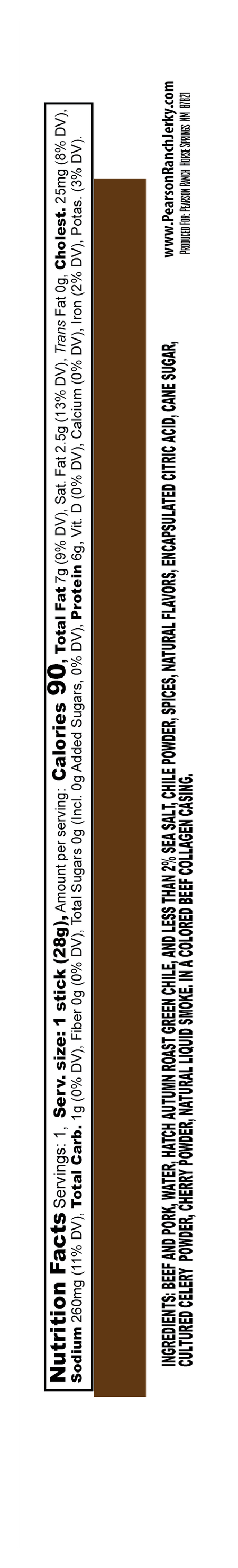 INGREDIENTS: BEEF AND PORK, WATER, HATCH AUTUMN ROAST GREEN CHILE, AND LESS THAN 2% SEA SALT, CHILE POWDER, SPICES, NATURAL FLAVORS, ENCAPSULATED CITRIC ACID, CANE SUGAR, CULTURED CELERY POWDER, CHERRY POWDER, NATURAL LIQUID SMOKE. IN A COLORED BEEF COLLAGEN CASING.
