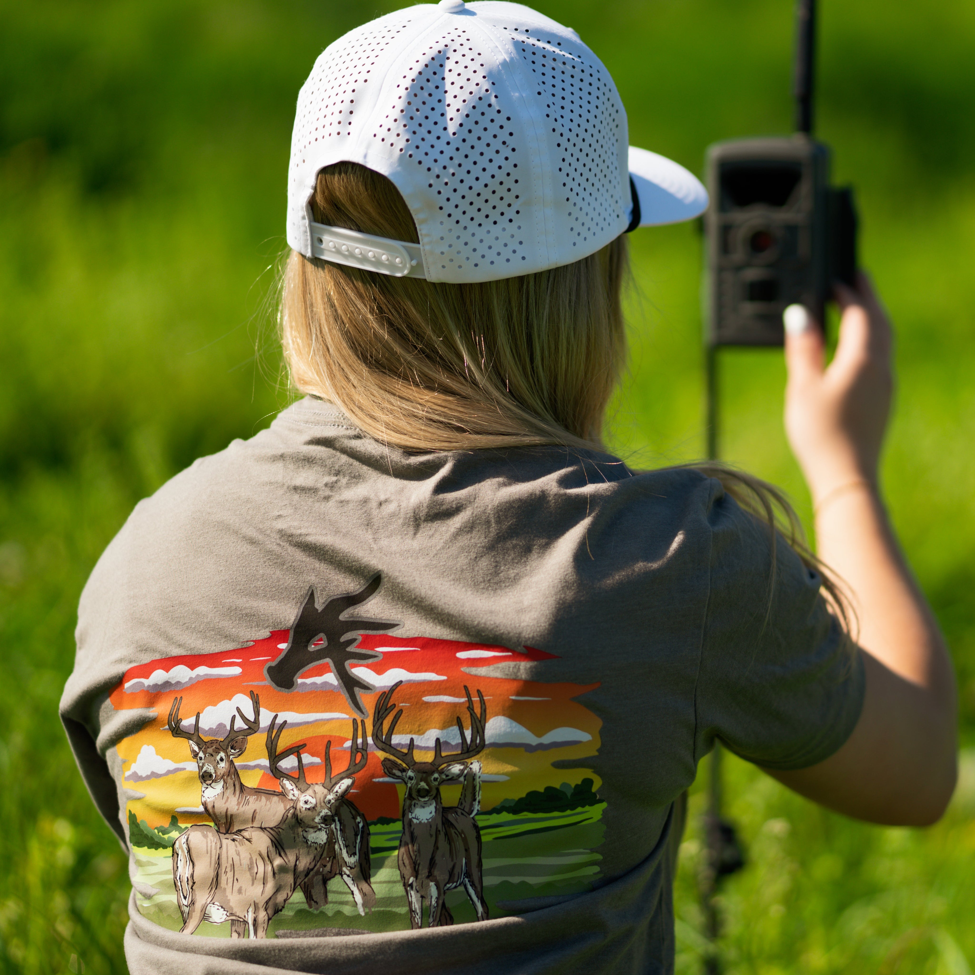 The Bachelor Party tee is the perfect blend of comfort and style. Made of a high-quality polyester cotton blend, this ultra-soft tee is perfect for all-day wear. Featuring a bachelor group of velvet whitetail in a bean field, you'll feel confident and comfortable showing off what we all dream of on those summer evenings.