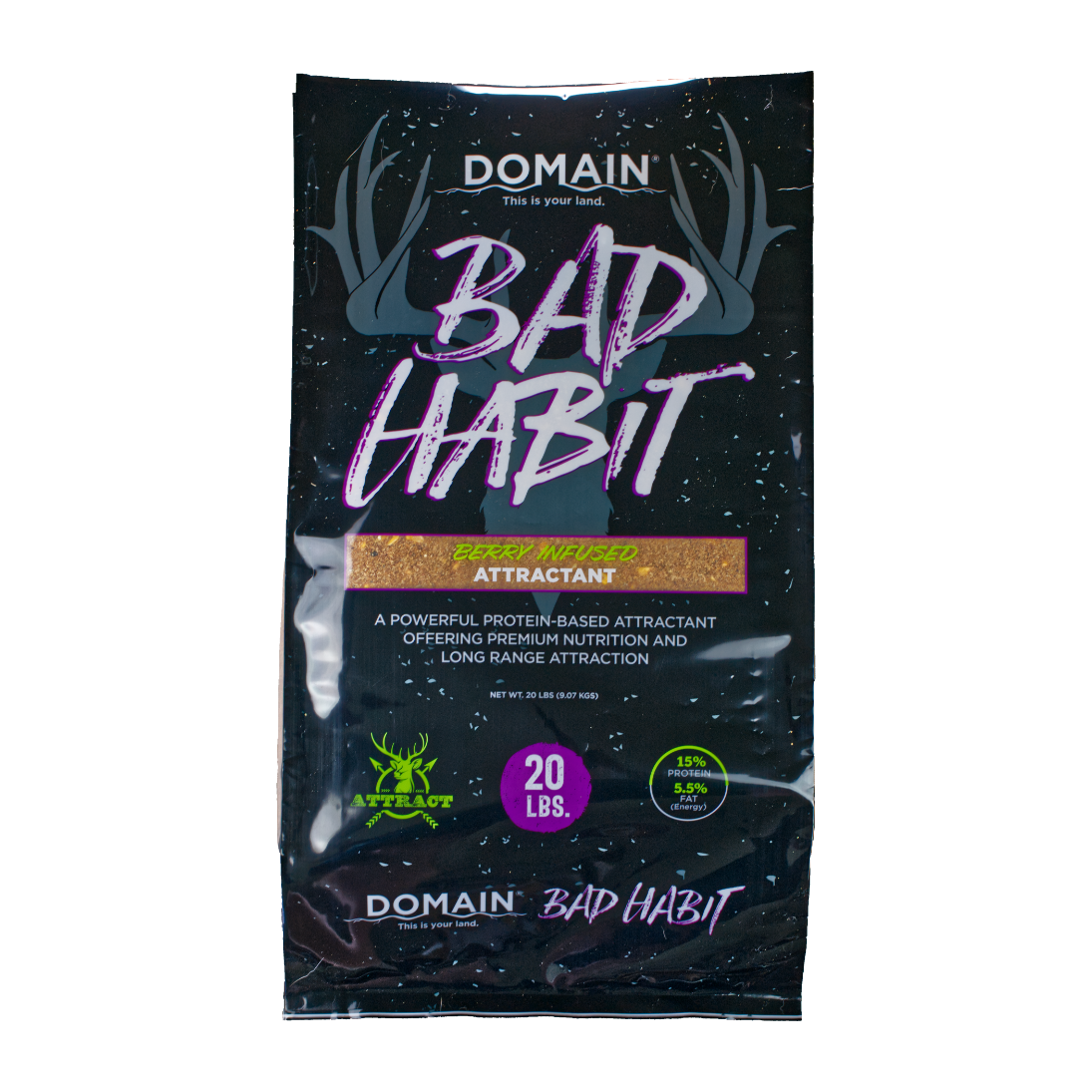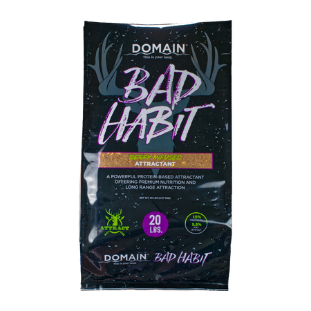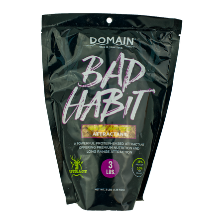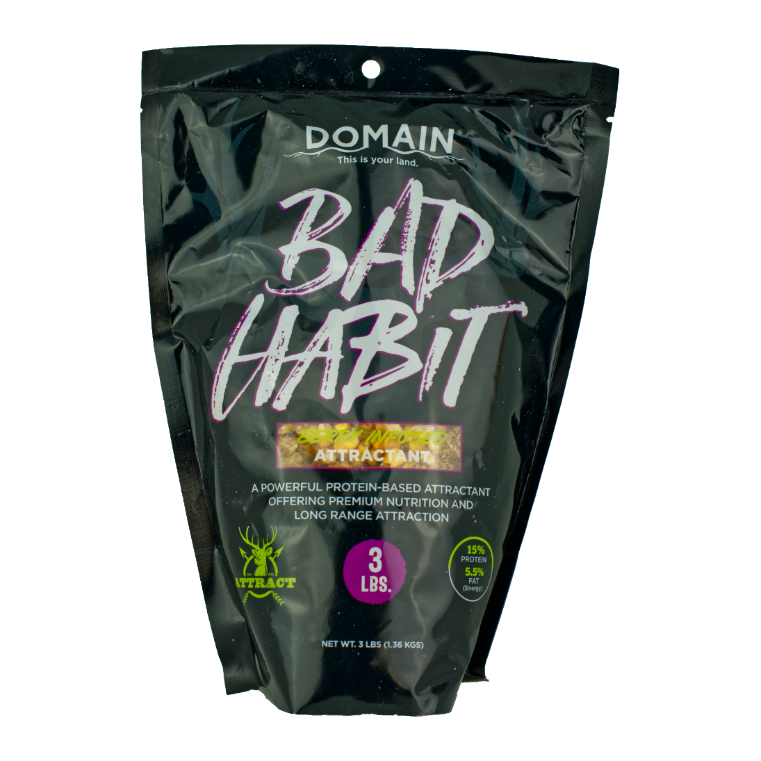 DOMAIN’S BAD HABIT ATTRACTANT IS SPECIALLY FORMULATED TO ATTRACT DEER AND PROVIDE AN ENHANCED NUTRITIONAL PROFILE THROUGH KEY INGREDIENTS , SUCH AS PROTEIN, FAT (ENERGY), VITAMINS AND MINERALS. ENHANCED WITH OUR BERRY INFUSED FLAVOR AND AROMA, THIS POWERFUL ATTRACTANT WILL ATTRACT DEER FROM LONGER DISTANCES AND HELP INCREASE CONSUMPTION AS A MEANS OF OPTIMIZING NUTRIENT AVAILABILITY. BAD HABIT CAN BE FED ON IT’S OWN OR MIXED WITH CORN OR FEED AND CAN HELP PROVIDE THE NUTRITIONAL FOUNDATION FOR YOUR DEER MANAGEMENT PROGRAM.