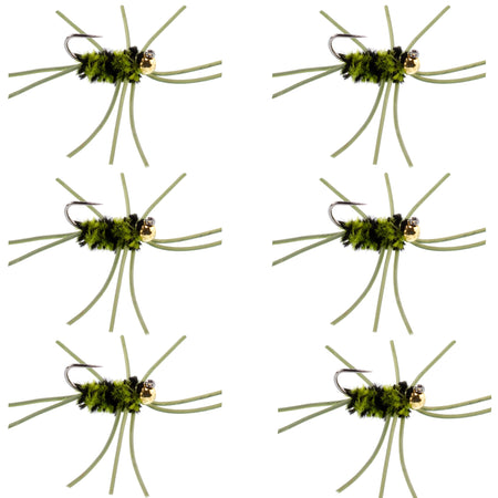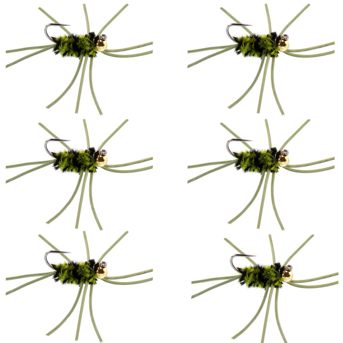 Barbless Pat's Rubber Legs Tungsten Bead Jigged Olive/Black Euro Nymph - Set of 6 Flies Hook Size 10