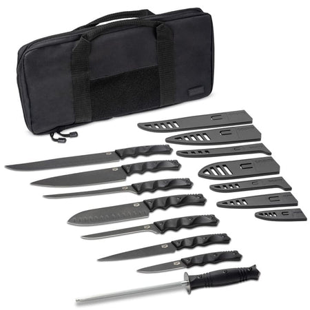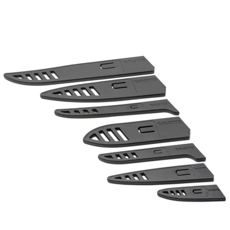The DFACKTO Basecamp Set includes 7 knives with protective sheaths and a honing steel from the Interceptor Series lineup all tightly secured in a rugged carrying case.
