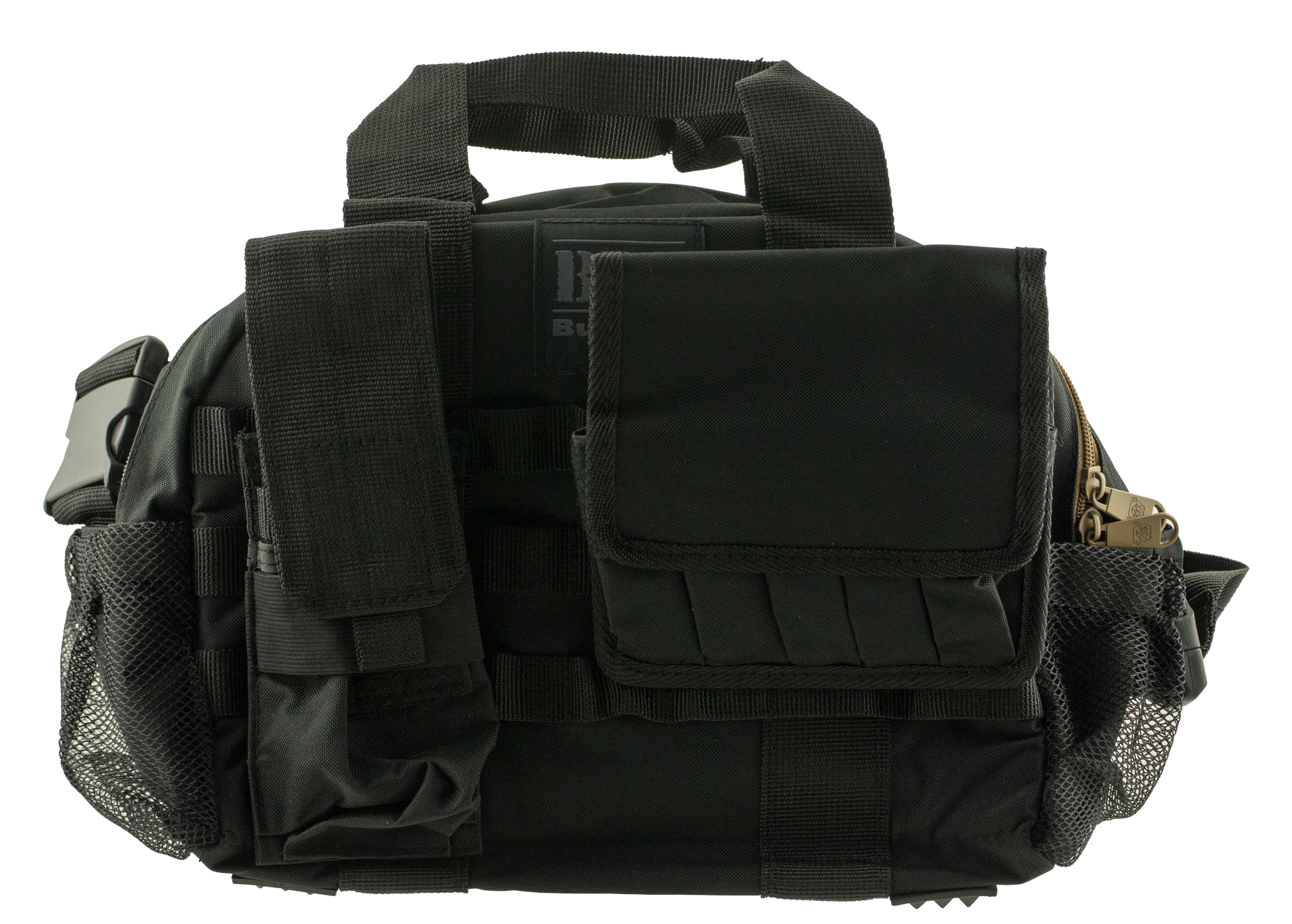 Bdt's tactical range bag with molle mag pouches features a unique colorized zipper to identify pistol pouch which has super thick padding for added protection. A rigid bottom holds the bag's shape and polymer base pads keep bag dry at the range. It has an oversized accessory compartment, large, zippered high-visibility accessory pocket for low light conditions and dual mesh see-through end pockets. This range bag includes dual molle ar-style mag pouches, and pistol pouches for five double stack or 10 single stack mags. Includes dual color shell casing bags for reloading and an extra wide carry strap. This black range bag is 17" h x 12" w x 6"d.