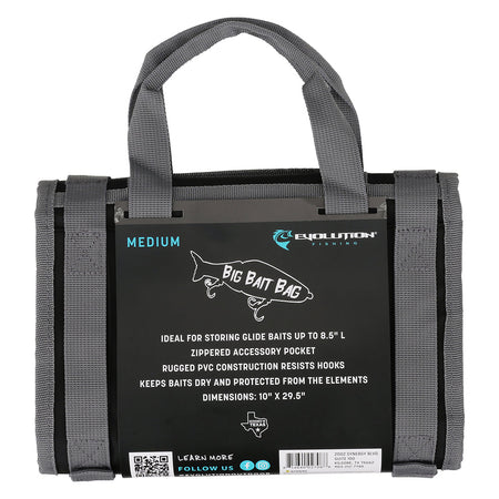 The roll-up design not only optimizes space as it is comparable in size to a 3600-tackle tray, but also enhances portability, allowing you to conveniently carry your arsenal of baits. The 10” bag houses baits under 10 inches in length and is the perfect size for many of the average size Glide Baits or Wakebaits. The 14” bag houses baits under 13 inches in length and is a go-to for hardcore swimbait fishermen. Four versatile gusseted pockets allow plenty of room within for large baits, soft plastic bags, and soft swimbait clam shells. One external pocket gives the angler room for bait accessories like extra tails and led wire. Each pocket is equipped with two weep holes ensuring water will not get trapped inside. Whether you're a shore fisherman or fishing competitive tournaments, rest assured that your baits remain organized and protected within this sleek and thought-out bag. Embrace the epitome of durability and functionality with our Roll-Up Big Bait Bag, the ultimate solution for big bait storage.