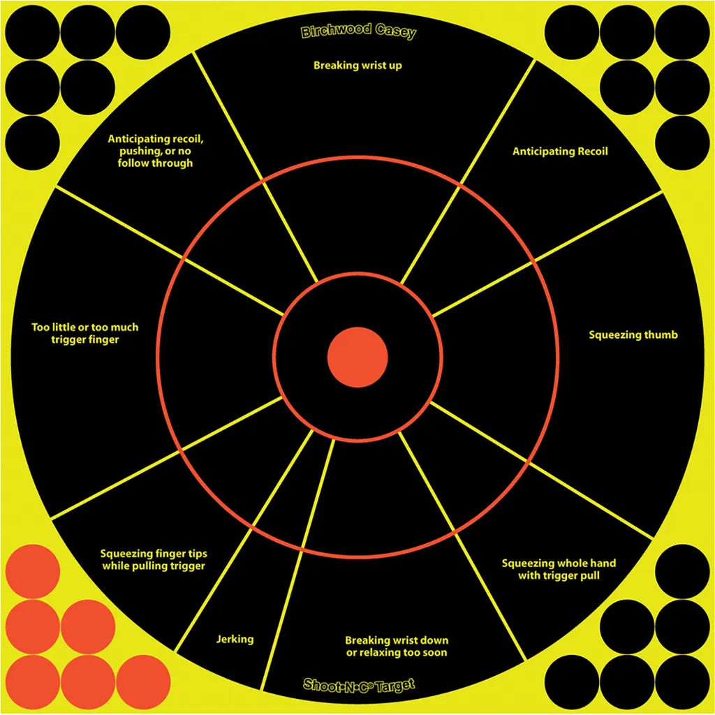 Shoot-N-C Targets are a reactive target that create a sharp, highly visible, chartreuse ring around each bullet hole upon impact reducing the need to walk to the target. Each target have an adhesive backing and pasters for easy mounting and repair.