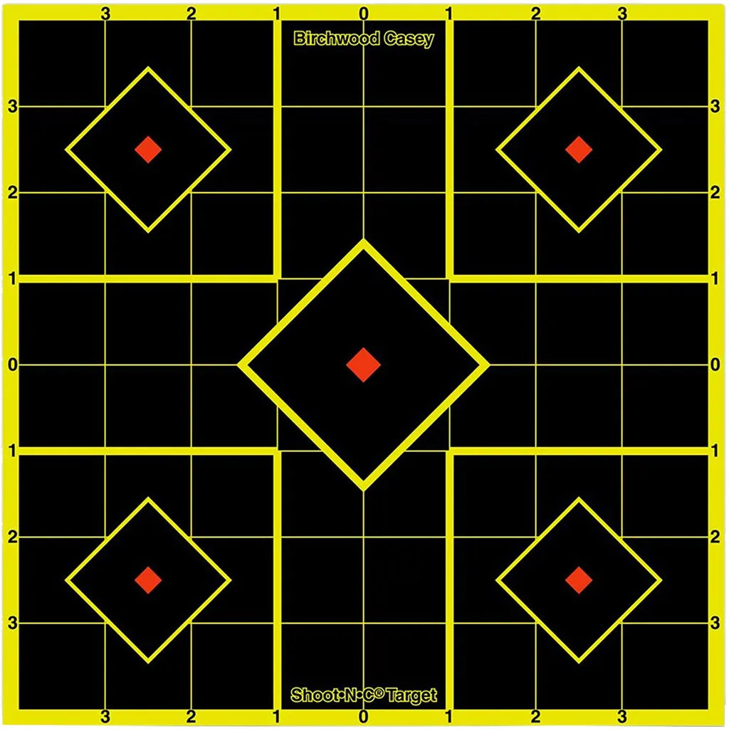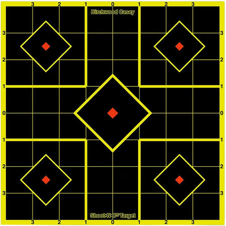 The Birchwood Casey Shoot-N-C Target features five targets on each sheet. The center target is for sighting-in and four smaller targets are for testing results of various ballistic loads or for confirmation of sight-in groups. There are convenient 1 inch numbered grid lines to simplify scope adjustments.