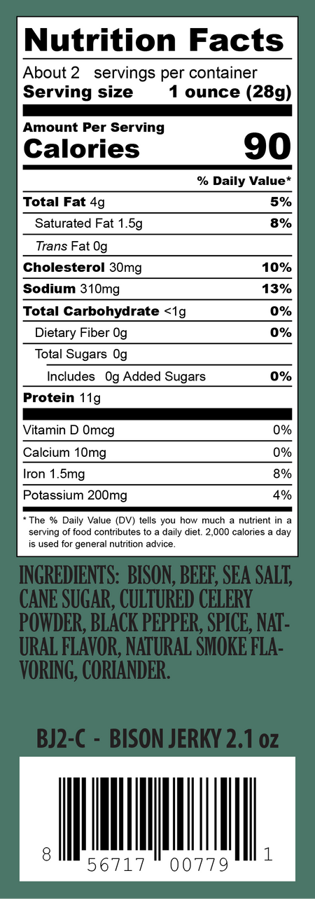 INGREDIENTS: BISON, BEEF, SEA SALT, CANE SUGAR, CULTURED CELERY POWDER, BLACK PEPPER, SPICE, NATURAL FLAVOR, NATURAL SMOKE FLAVORING, CORIANDER.