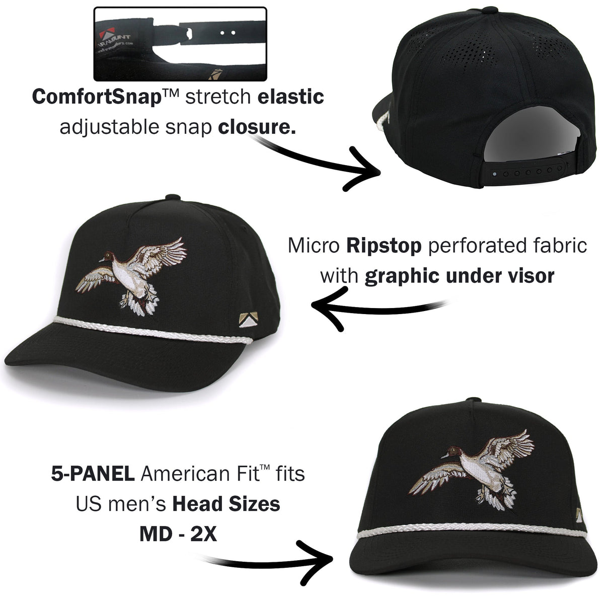The black pintail waterfowl duck hunting 5-panel trucker hat features ultra lightweight micro-ripstop fabric. Coupled with a trucker style structured front panel featuring a detail pintail duck embroidery. Additionally, features our COMFORT SNAP elastic closure which couples the stretch fit of a custom cap with the adjustability of a snapback. Lastly, this duck hunting cap rope cap features American Fit sizing which fits men's head sizes MD - XX. Â