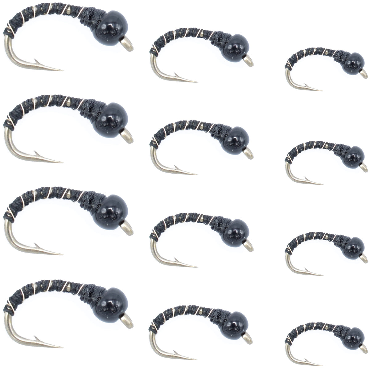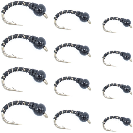 Black Zebra Midge Assortment - Black Bead Head - 1 Dozen - 4 Each of 3 Sizes 14, 16, 18 - Tailwater and Lake Fly Fishing Flies Assortment