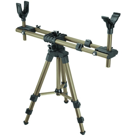 Enjoy the rock-solid bench rest stability in a lightweight, portable shooting rest you can take anywhere. The innovative cast-aluminum hub provides adjustable rotation and tilting for fast, stable target acquisition. High-strength extruded-aluminum construction provides corrosion-resistant durability and keeps the total weight under 6 lbs. Front and rear supports independently adjust for height. Upper frame adjusts for length and pivot point for perfect fit and balance. The gun rest also features a sturdy, dual-tube frame for easy length and balance adjustment and superior stability. One-piece design quickly collapses and folds for hassle-free transport and storage. Independently adjustable legs provide a height range of 20" to 42" and the ability to balance on uneven terrain. Rugged, all-surface feet. Detachable carry strap included.