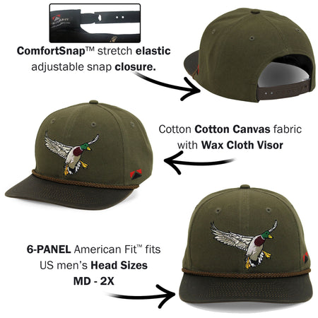 The canvas landing mallard hat is built on our Riverside 6-Panel baseball cap style. This waterfowl hat features a heavy cotton canvas fabric coupled with a wax cloth visor for a durable weather resistant hat ready for the migration. Our COMFORT SNAP™ snapback closure combines the stretch of elastic with the adjustability of a snapback, allowing for a custom stretch fit. Lastly, this waterfowl mallard drake hat features our American™ Fit sizing that fits men’s US head sizes MD – XX.