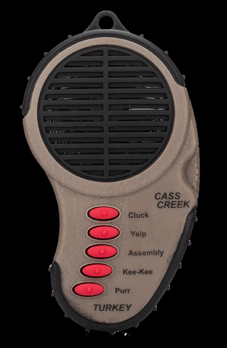 The cass creek ergo electronic turkey call is compact with an ergonomic grip.The cass creek ergo electronic turkey call features real live turkey calls- cluck, yelp, assembly call, kee-kee and purr.Calls by young turkey, turkey hen and adult male.Operates on three aaa batteries and comes with a belt clip.