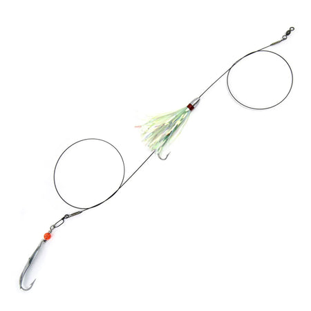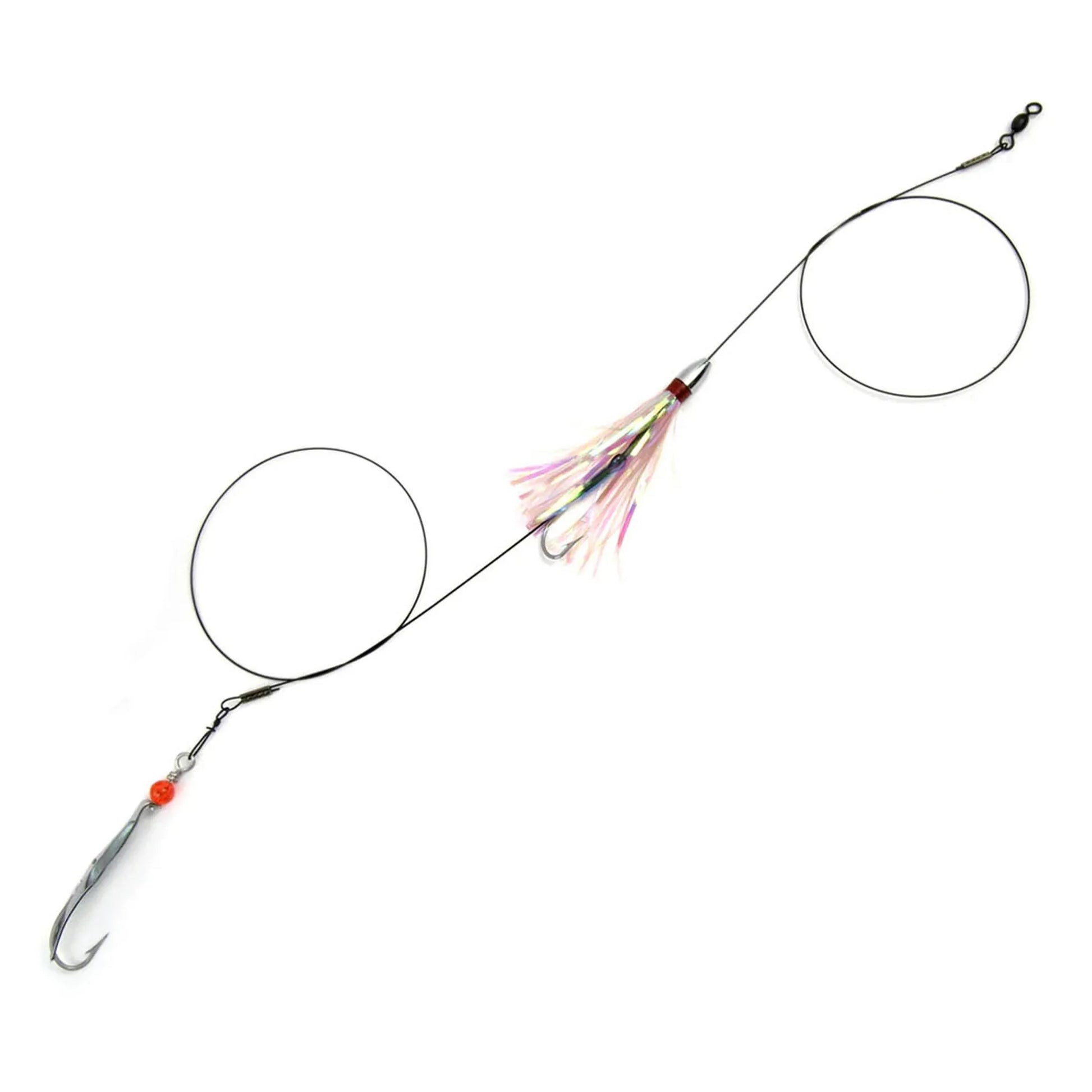 A hands down favorite for trolling along the Florida and Gulf Coasts, the Clarkspoon Mackerel Duster Rigs are the best way to fill the fish box with plenty of Spanish mackerel. The Mackerel Duster Rigs combine two popular trolling lures to double you chances at success; Mylar Dusters and the famous Original Clarkspoon. A 1/8oz mylar duster is rigged on a 2/0 hook ahead of a #0 spoon on 45lb black coated wire. This wire rigging is especially nice to have when larger toothy predators like king mackerel and bluefish are around. These rigs can be run across the surface or attached behind a planer or trolling sinker to troll at depth. Use the barrel swivel at the top of the rig to attach you main line or leader, and the ball bearing snap swivel at the bottom to attach your Clarkspoon or other desired trolling lure.