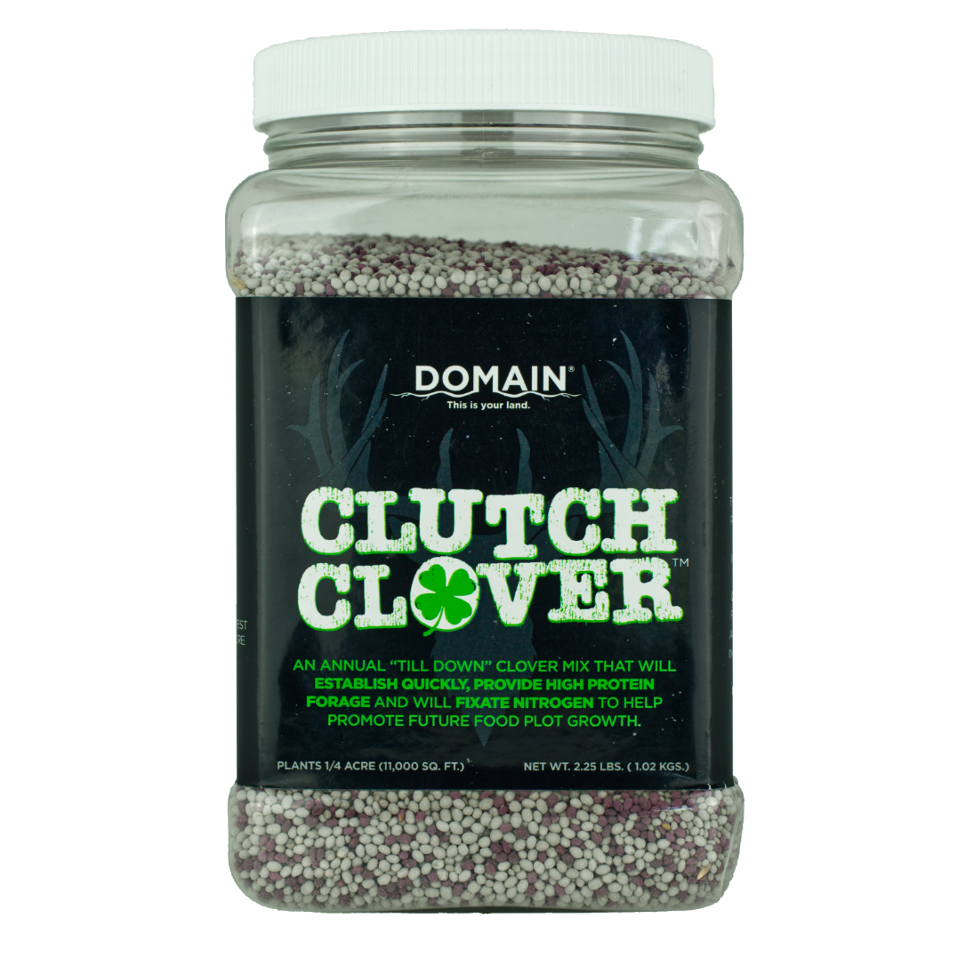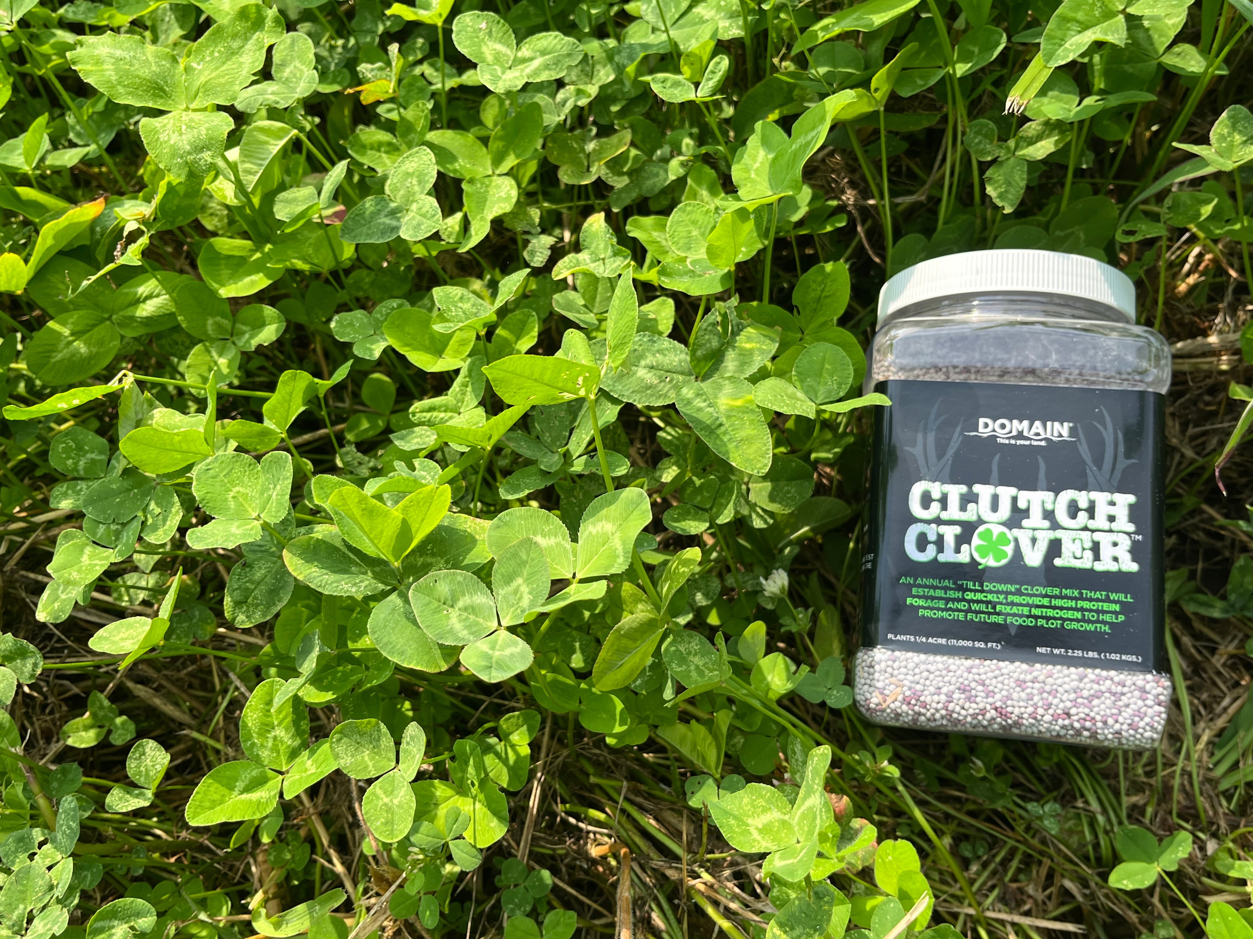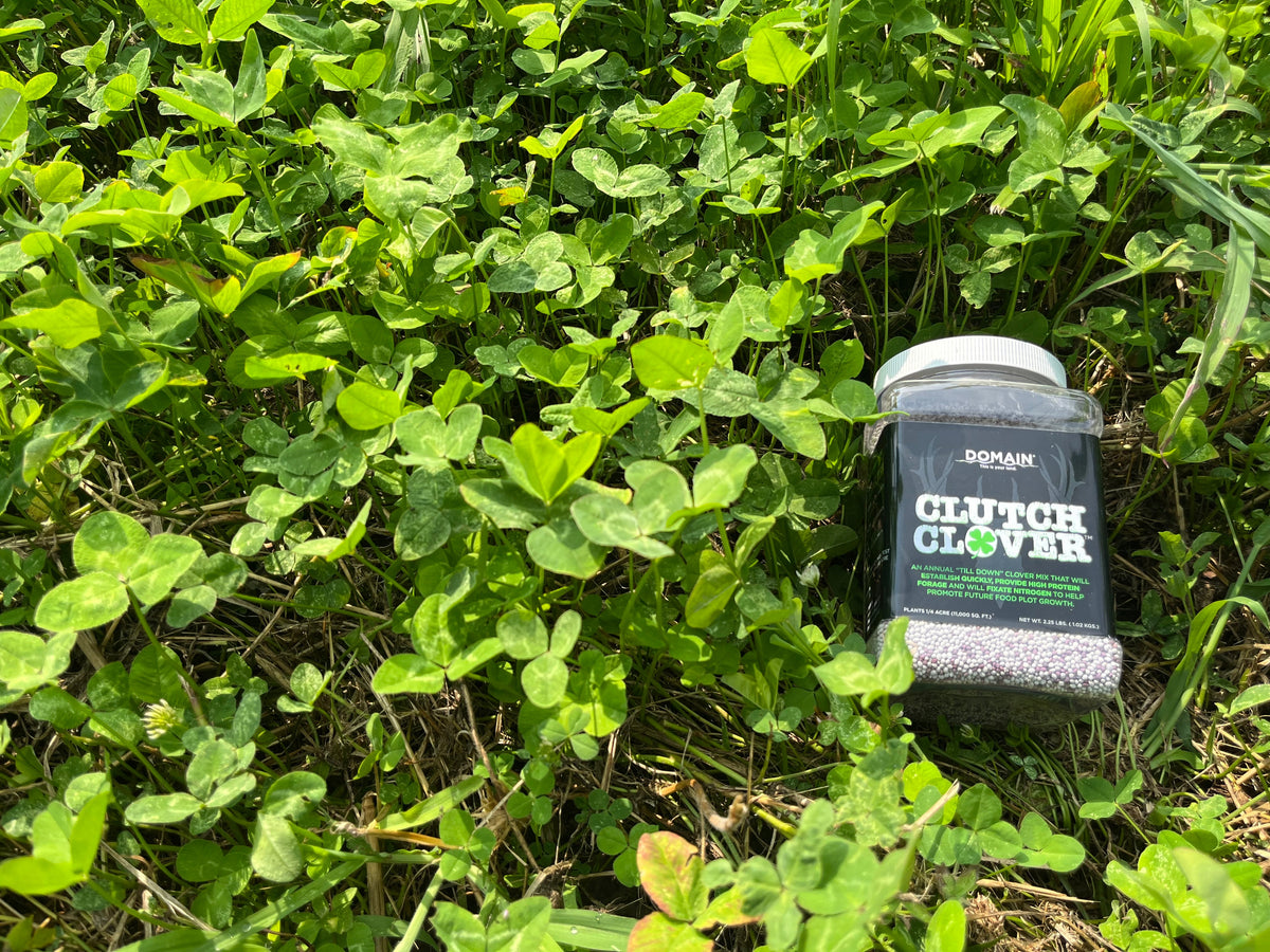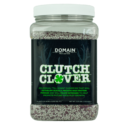 CLUTCH CLOVER IS A UNIQUE COMBINATION OF 3 SPECIAL VARIETIES OF ANNUAL CLOVER DESIGNED TO ESTABLISH QUICKLY AND PROVIDE A QUICK PROTEIN SOURCE TO HANDLE BROWSE PRESSURE WHILE BUILDING UP BIOMASS. DUE TO ITS QUICK, LUSH GROWTH, CLUTCH CLOVER WILL QUICKLY BECOME A FAVORITE LOCATION FOR SPRING, SUMMER, AND EARLY FALL FEEDING DUE TO THE YOUNG TENDER PLANTS THAT PRODUCE TONS OF BIOMASS AND PROTEIN. IN ADDITION TO THE FORAGE PRODUCTION, CLUTCH CLOVER IS AN IDEAL “TILL DOWN” OPTION FOR PLOT ROTATIONS, AS IT FIXATES NITROGEN AND ADDS THAT BACK TO THE SOIL FOR FUTURE FOOD PLOT PLANTING. CLUTCH CLOVER CAN BE PLANTED ON ITS OWN, MIXED WITH LONG-LASTING PERENNIALS AS A DUAL CROP, OR COMBINED WITH BRASSICAS IN THE FALL TO OFFER A GREAT SPRING GREEN UP AND SOIL FIXER. AS AN ANNUAL TILL DOWN MIX, CLUTCH CLOVER OFFERS A VERSATILE FOOD PLOT OPTION PERFECT FOR LOW MAINTENANCE, MINIMUM TILL BACKWOODS PLOTS OR AS A ROTATIONAL CROP IN YOUR LARGE DESTINATION FOOD PLOTS.