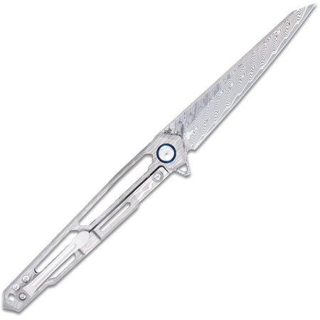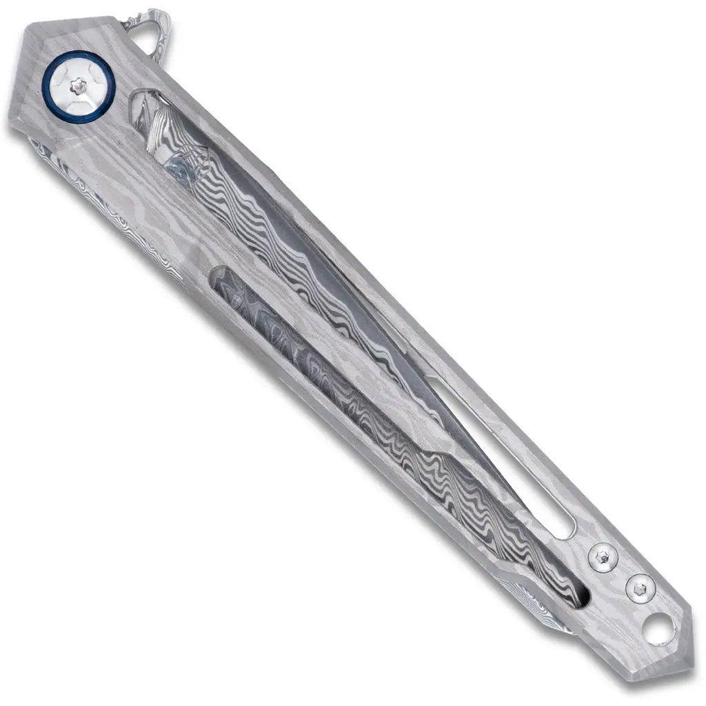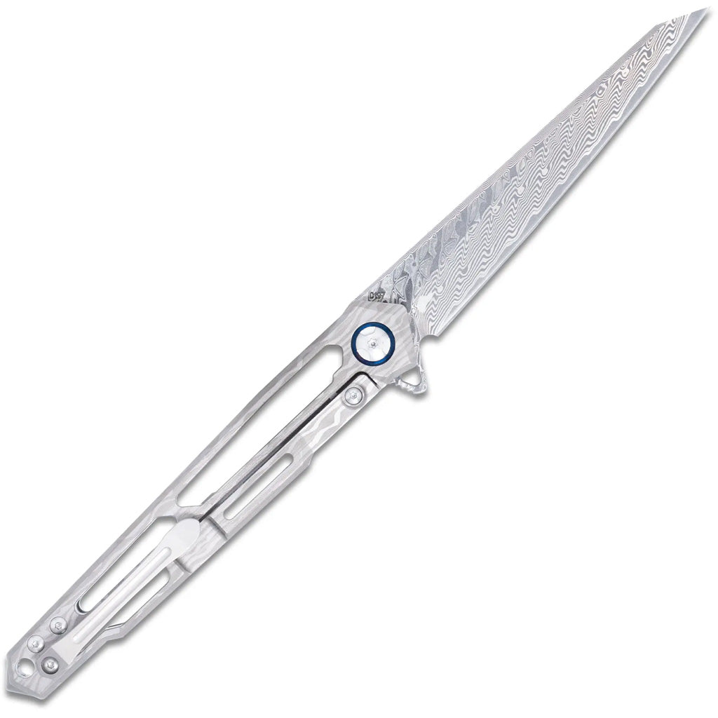 The Ghost frame lock knife is designed for those who appreciate both beauty and performance in their everyday carry. This knife features a striking titanium handle with a cut-out design that not only reduces weight but also adds a distinctive aesthetic touch. The handle’s ergonomic design ensures a comfortable grip. The Damascus Wharncliffe blade renowned for its unique patterning and exceptional cutting performance provides outstanding edge retention and durability. Equipped with a smooth ball bearing pivot system, the Ghost ensures effortless blade deployment and secure locking. The titanium clip allows for convenient, discreet carry, ensuring the knife is always accessible when needed.