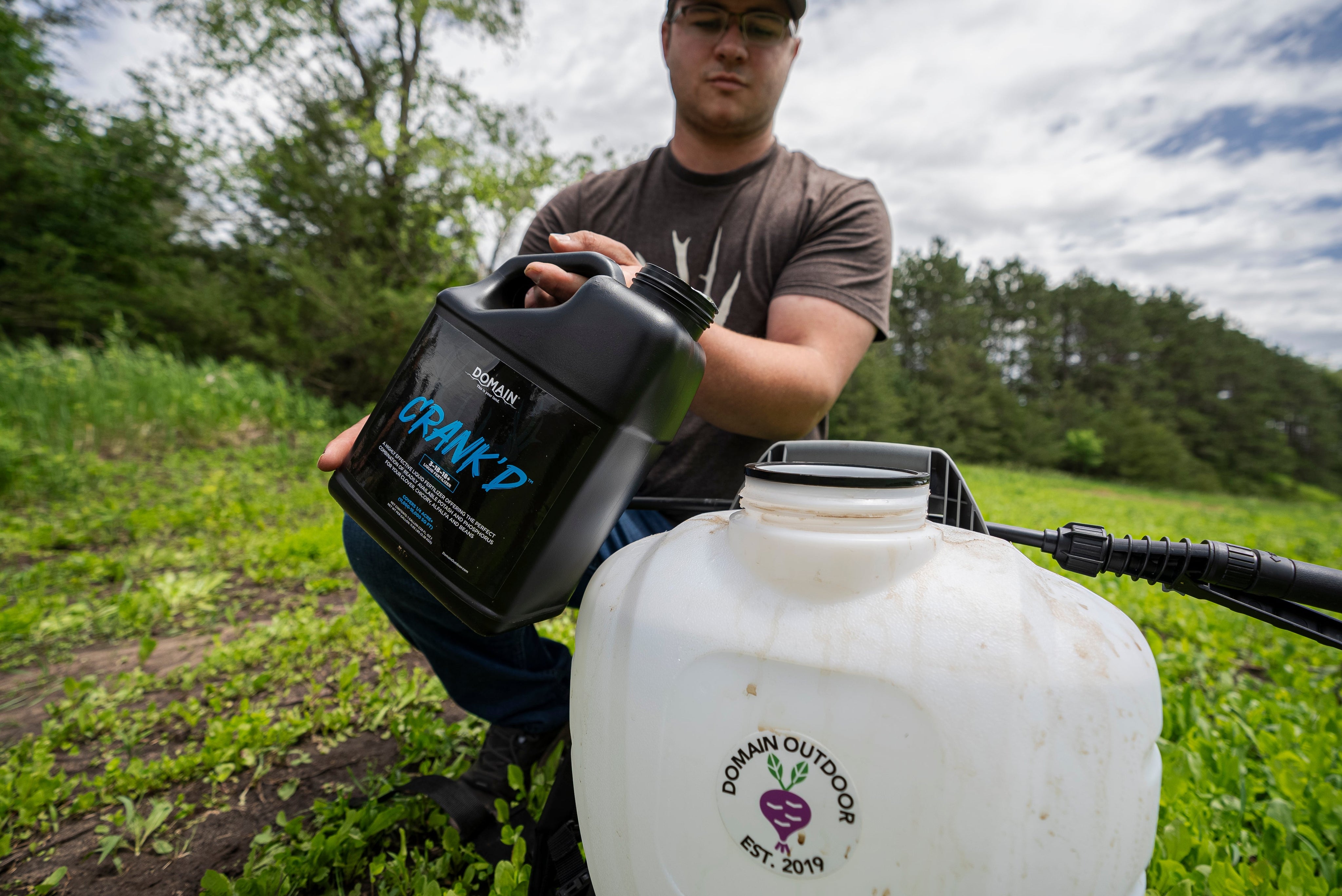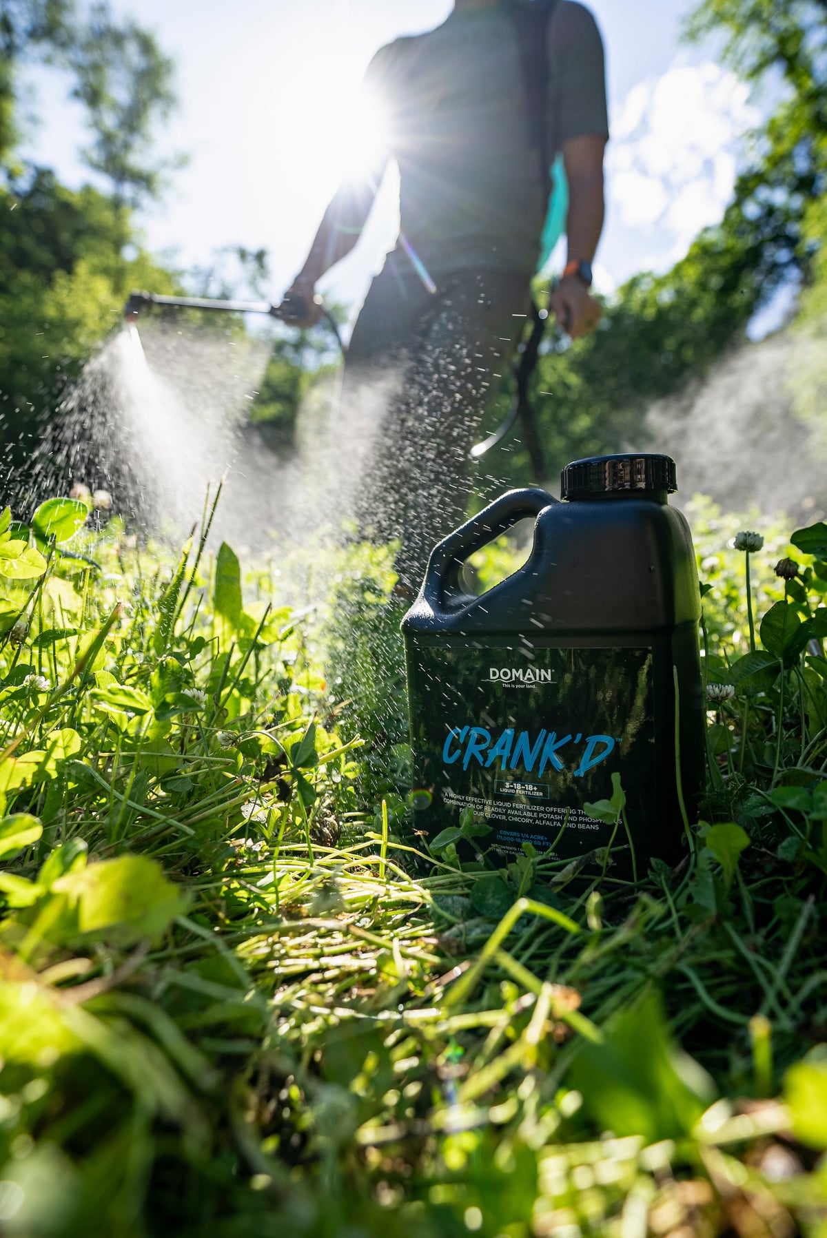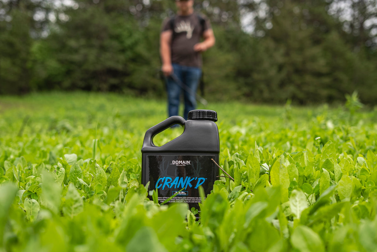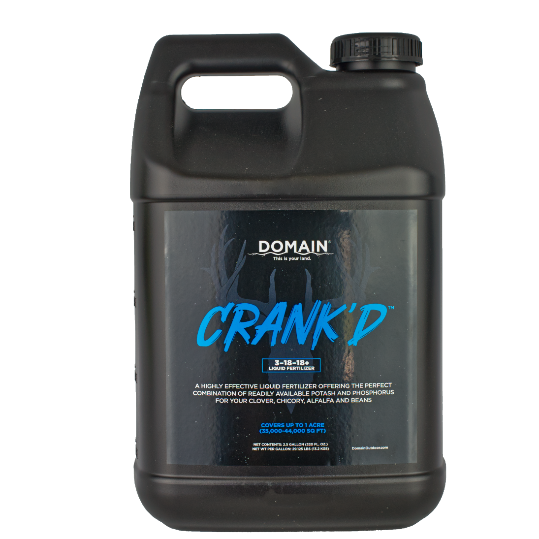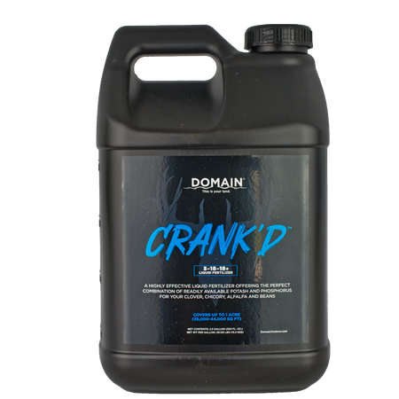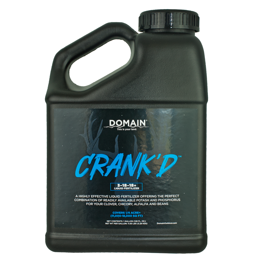CRANK'D™ 3-18-18+ ORTHO-PHOSPHATE LIQUID FERTILIZER IS A POWERFUL AND ECONOMICAL BLEND PERFECT FOR APPLICATION PRIOR TO PLANTING OR DURING VARIOUS STAGES OF FOOD PLOT GROWTH. THIS COMBINATION OF READILY AVAILABLE POTASH AND PHOSPHORUS MAKES IT THE IDEAL FERTILIZER SOLUTION FOR CLOVERS, CHICORY OR BEANS. CRANK'D™ 3-18-18+ IS ALSO COMPATIBLE WITH FREIGHT TRAIN™ AND CAN BE MIXED TO MAKE THE PERFECT SOLUTION FOR YOUR BRASSICA FOOD PLOTS! CRANK'D™ 3-18-18+ HAS A SOIL LIFE OF ONE GROWING SEASON WITH ONE APPLICATION AND IS DESIGNED TO PROVIDE READILY AVAILABLE NUTRIENTS DIRECTLY TO THE PLANT AND IS ABSORBED THROUGH BOTH THE ROOTS AND LEAVES. GROUND ABSORPTION PROVIDES SLOW RELEASE AND LIVES IN YOUR SOIL FOR ONE GROWING SEASON, WHEREAS ANYTHING THAT HITS THE PLANT WILL BE ABSORBED IN THE FIRST 24 HOURS FOR QUICK BOOST OF NUTRIENTS. THE SMALL AMOUNT OF NITROGEN FOUND IN CRANK'D™ ACTS AS A CARRIER AGENT AND HELPS PROVIDE A BOOST IN NATURAL NITROGEN PRODUCTION IN THE PLANT. THE ORTHO-PHOSPHATE FORM OF PHOSPHORUS ELIMINATES THE BREAKDOWN TIME AND OFFERS READILY AVAILABLE PHOSPHORUS IN THE EARLY STAGES OF GROWTH WHEN IT IS NEEDED MOST. CRANK'D™ 3-18-18+ PROVIDES YOUR FOOD PLOT 6-7 TIMES THE AVAILABILITY OF FERTILIZER VERSUS GRANULAR FERTILIZER. CRANK'D™ 3-18-18+ IS INTENDED AS A SUPPLEMENT AND SHOULD BE USED IN CONJUNCTION WITH YOUR NUTRIENT MANAGEMENT PROGRAM.