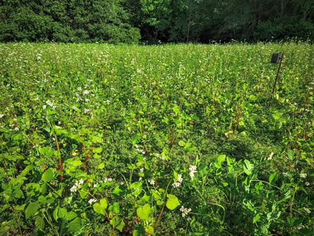 BUCKWHEAT IS THE PERFECT ADDITION TO YOUR FOOD PLOT THIS SEASON. THIS FAST-GROWING ANNUAL IS IDEAL FOR SPRING AND SUMMER PLANTINGS, THRIVING IN A WIDE RANGE OF SOIL TYPES AND CONDITIONS. BUCKWHEAT ESTABLISHES QUICKLY, PROVIDING CRITICAL FORAGE FOR DEER DURING THE WARM SEASON. NOT ONLY DOES IT OFFER A HIGH-PROTEIN FOOD SOURCE, BUT IT ALSO WORKS AS AN EXCELLENT SOIL BUILDER, IMPROVING ORGANIC MATTER AND PROVIDING WEED CONTROL THROUGH ITS DENSE GROWTH.