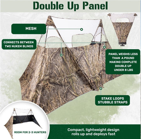 Nukem Double Up Panel XL in Mossy Oak Habitat. Take your hunting experience to the next level with this innovative panel designed to fit between 2 XL size Nukem Blinds. With over 11 feet of width, this panel blind set up comfortably accommodates 2-3 hunters, providing maximum concealment.