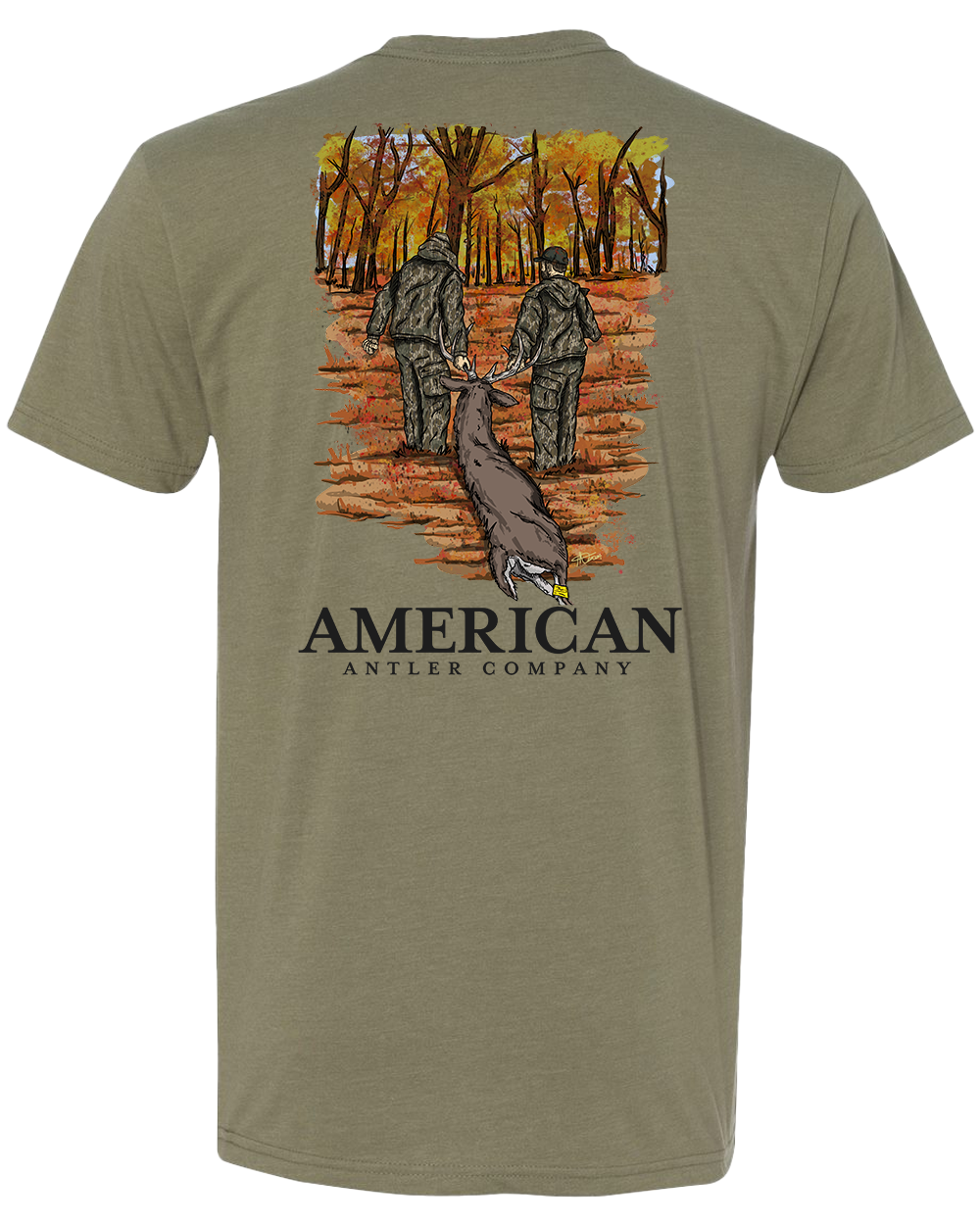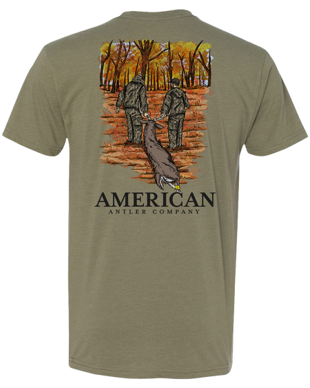 Introducing the Drag Out Tee, crafted from a premium cotton poly blend that's pre-shrunk and softer than butter. The shirt art depicts a Deer season scene, with good friends lending a hand to help drag out that big buck. Experience the ultimate in comfort and style with this high-quality tee.