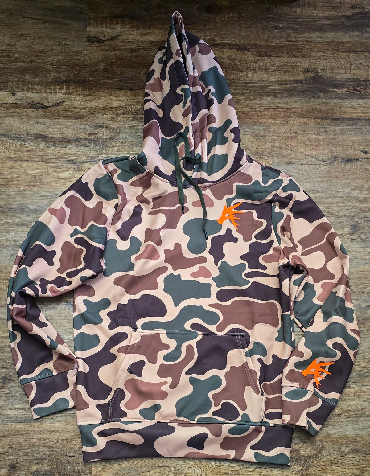 Upgrade your outdoor gear with our Duck Camo Performance Fleece Hoodie. Made with performance fleece, this hoodie is warm and moisture wicking, keeping you comfortable and dry in any weather. Its anti-microbial properties make it perfect for easy transitions from the field to everyday wear. Experience the best in comfort, performance, and style with our hoodie.