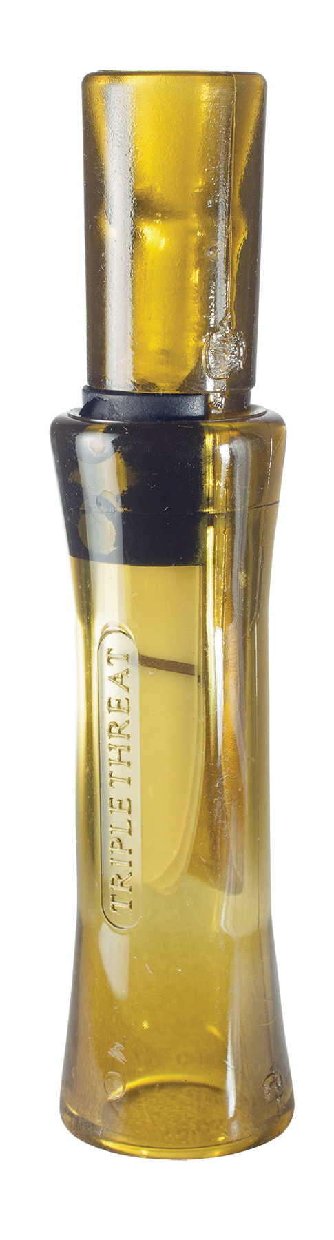 The duck commander triple threat duck call realistically mimics the sounds of a mallard hen, including quacks, feed calls and hen calls and features a triple reed system for effective use.