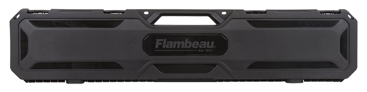 Flambeau's express gun case is constructed of a rugged polymer with convoluted foam set with deep cushioning and piano-style hinges for storage safety when locked. It utilizes four (4) lock hasps and latches. This model has a black finish and is compatible with one (1) scoped rifle or shotgun. It has interior dimensions of 46.125" l x 9.25" w x 3.5"d.