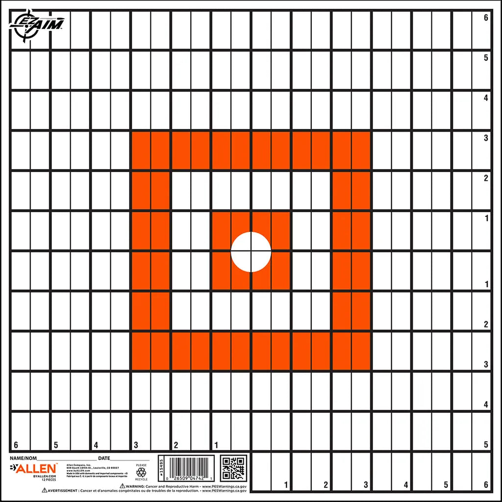 EZ-Aim Shooting Target Systems for practice and competition. Black and White with squared orange bullseye. 1" grid markings horizontal and vertical. 12-inches square paper target. Bright inks & high contrast colors are viewable from long distances.