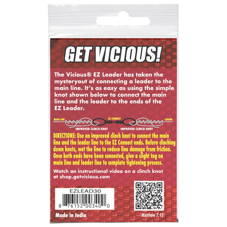 Simplify the process of attaching leader to the main line with the VIcious EZ LEADER connector. This short insert features easy-to-use loops on each end. Simply use your favorite knot to tie the main line to one end and the leader to the other. Then slip down the loops and you are ready to fish.