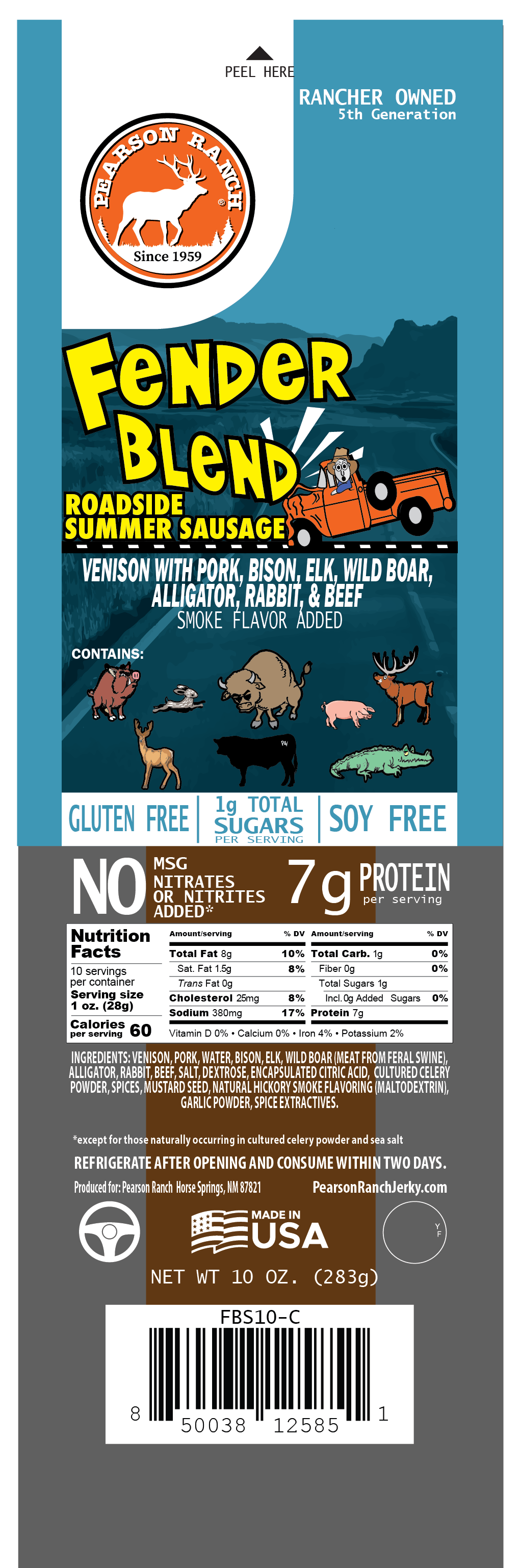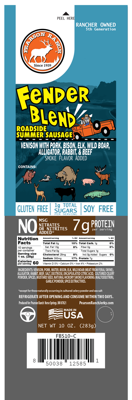 Pearson Ranch's very own "road side" summer sausage. Fender Blend is a fun, yet extraordinarily flavorful, blend of premium meats.