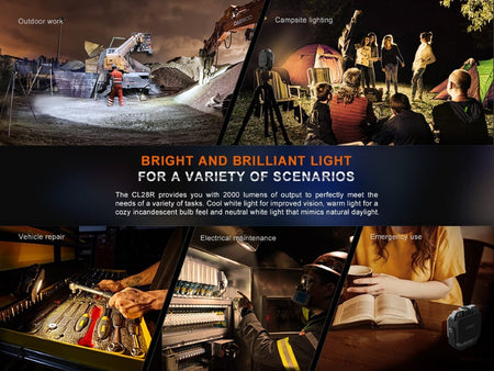 The Fenix CL28R is an extremely popular light that can be useful for a variety of applications - from camping to professional photography to construction to auto repair. It offers a "stepless" brightness adjustment from 10 to 2000 lumens and stepless color temperature regulation from 2700K to 6500K. With its 360° rotating handle, magnetic base, and tripod socket, the CL28R has an ultra-wide 160° beam angle to satisfy various needs. The red light mode preserves night vision or can be used for emergency signaling. The 10,000 mAh rechargeable battery offers up to 45 days of run time and can be fast-charged with USB C in 4 hours. It is also resistant to 1.5m drops and has an IP66 water-resistance rating, ensuring a durable and reliable experience.