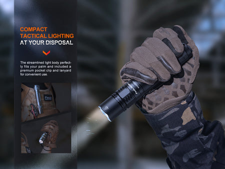 Constructed for tactical & pro tasks, the Fenix PD36R PRO Tactical Flashlight radiates 2800 Lumens & 36,600 candela of strong light for 1250 ft. & offers features like a detachable tail cap & two tail cap switches. Plus, it has a 75% higher output than the PD36R & fast access to true-instant strobe. Tail cap design allows adding tactical accessories like a remote pressure switch & weapon rail mounts. The rechargeable V2.0 21700 battery can be recharged via the onboard USB-C port. Compatible w/ 18650 batteries & the ALF-18 battery adapter, this 5.74" x 1.04" flashlight is lightweight & IP68 waterproof rated for 1.5m drops. Crafted of high-strength aluminum, it's a powerful yet portable flashlight.