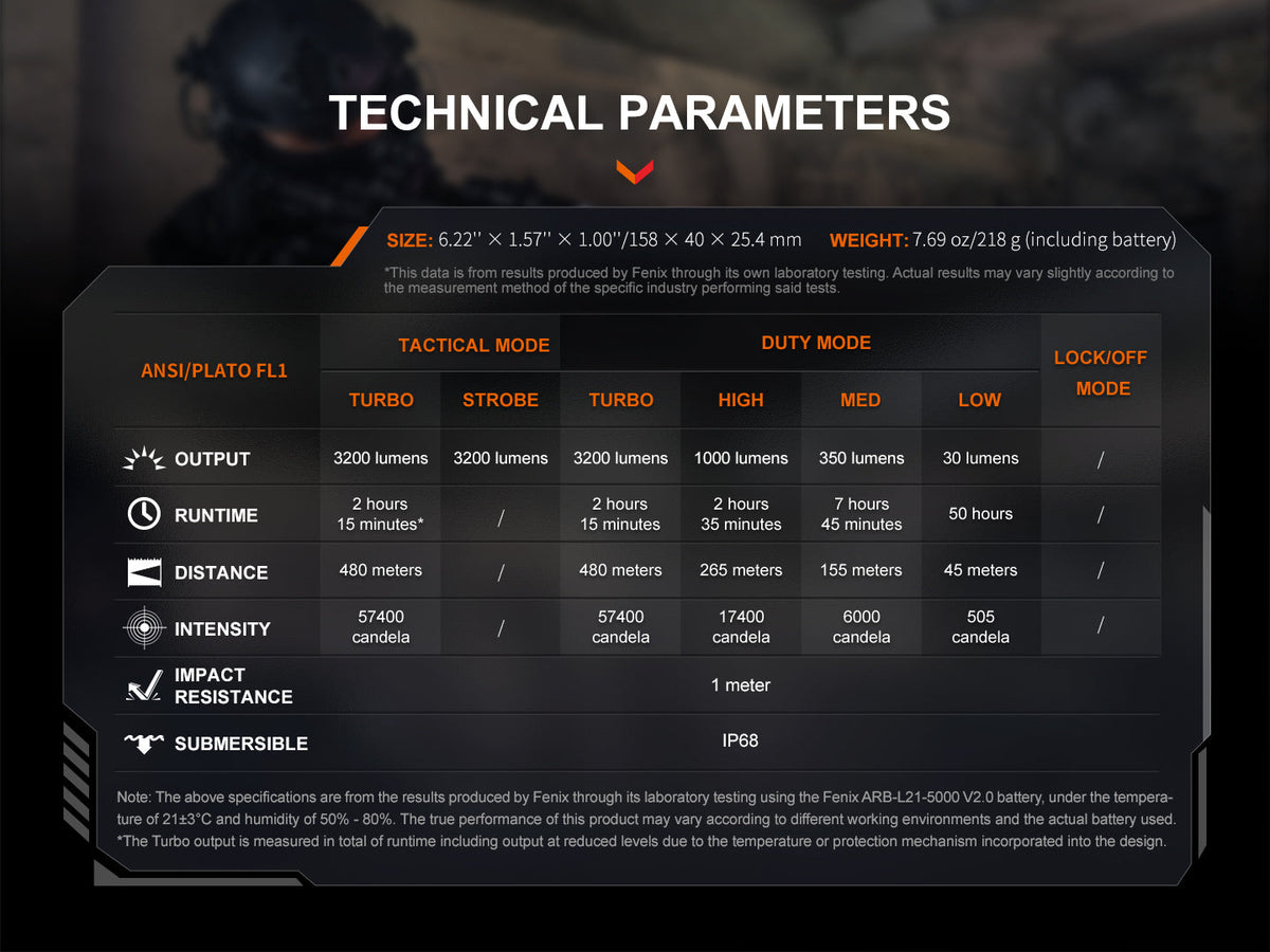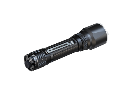 The Fenix TK22R features a 3200 lumen maximum output, seamless transition between tactical and duty modes, and the Patented Flexi-sensa Control Switch for intuitive operation. Its hidden USB-C charging port ensures swift recharging, complemented by the robust 5000mAh included battery. This flashlight boasts durability with tungsten steel alloy striking tips and double springs, optimized for tactical use. Innovative APF technology ensures consistent brightness, while intelligent overheat protection keeps performance optimal. Even with its charging port exposed, its resilience shines through, maintaining a waterproof rating of IP68.