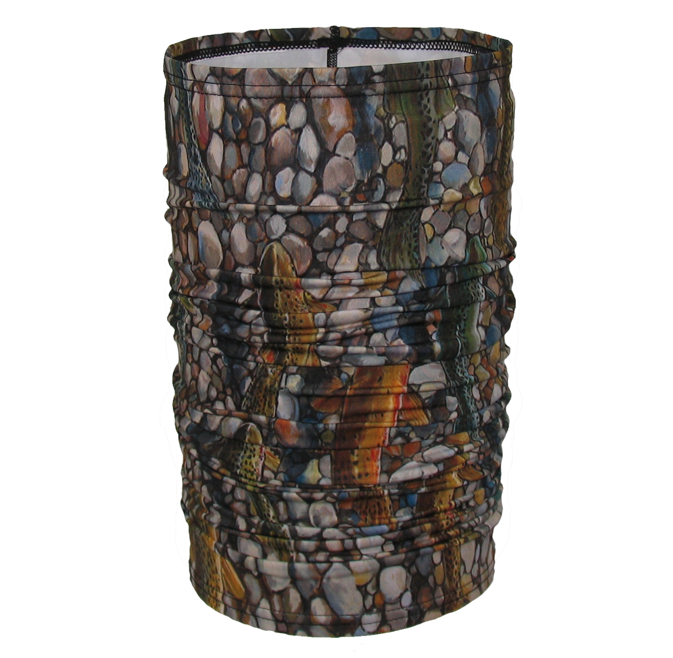 Our Fin-Flank Neck Gaiters provide extreme sun protection. Long enough to pull up over your face and over your head. We use Josh Udesen's "Trout Dreams" print on this cooling wicking poly-Spandex gaiter. Now available in LG/XL size for those with larger heads and necks.
