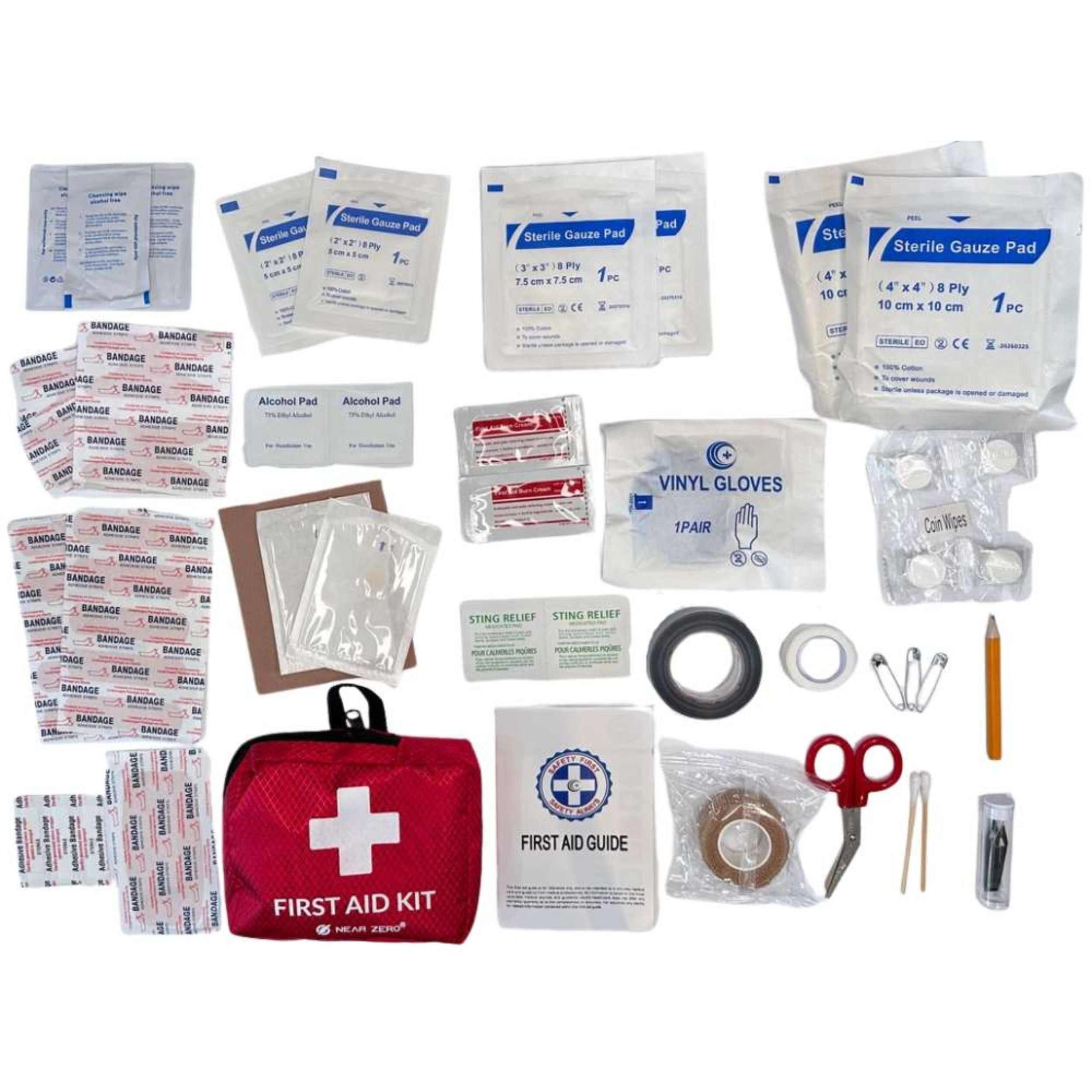 Near Zero 55-item First Aid Kit is perfect for the car, travel, camping, backpacking or hiking. Waterproof and ultralight. We have custom built the ideal kit, which includes essential items that are not easily found with other comparable first aid kits, such as duck tape, medical tape wrap, coin wipe cleaning towels, scissors, pencil, and much more! Well stocked with enough items to treat up to 3 people on a day hike. Weighs 6 ounces. Contains 55 pieces.