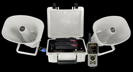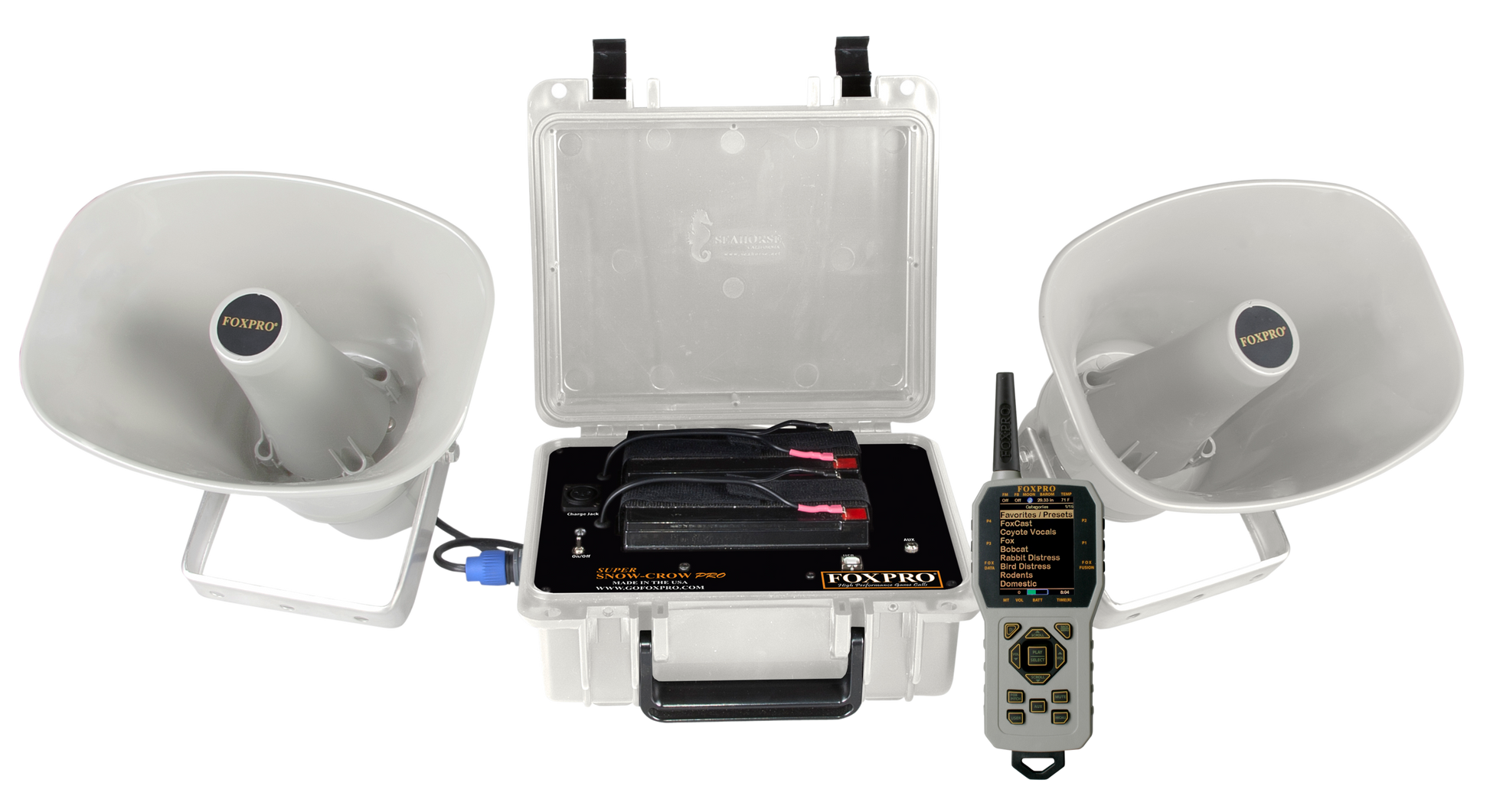 Bring those circling snow geese and crows within gun range, with extreme volume capabilities in the super snow crow pro from foxpro.This caller comes standard with 100 high quality foxpro sounds and can store and access up to 1000 sounds.It is powered by two 12 volt gel cell batteries.The sscp comes with two 30 watt external speakers and allows you to connect up to four external speakers, which have heavy duty connector plugs to hold up in the worst conditions.The tx-1000 remote control comes standard and features a full color graphic lcd screen which displays your sound list or sound categories, has a barometer indicator, moon phase indicator, temperature indicator, battery level indicator, timer or time clock, foxbang technology and much more.Foxmotion allows you to fade the sound from the left speakers to the right speakers to help sell the reality of your call sounds.Foxfusion allows you to mix and match any two sounds at the same time during your calling sequence.Foxpitch allows you to manipulate the pitch of the sound in an effort to trigger a response.Foxdata allows you to record real time information from each and every hunt so you can access the data for future reference.The super snow crow pro is proudly made in the usa