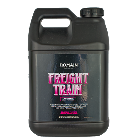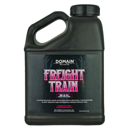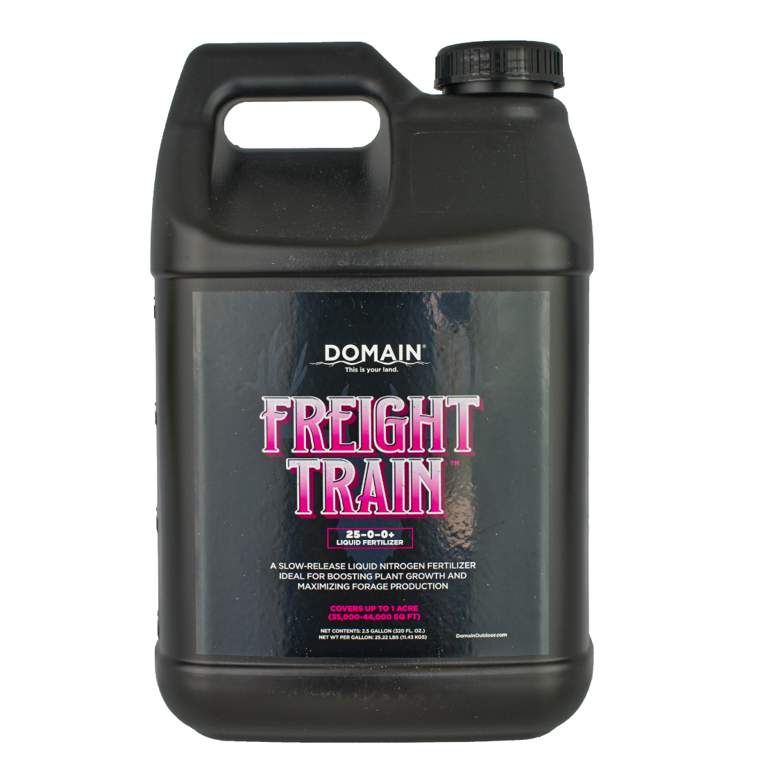 FREIGHT TRAIN™ 25-0-0+ LIQUID FERTILIZER IS A SLOW-RELEASE LIQUID NITROGEN FORMULA DESIGNED TO INCREASE PLANT GROWTH AND MAXIMIZE NUTRIENT AVAILABILITY TO YOUR PLANTS. FREIGHT TRAIN™ CAN BE SPRAYED DIRECTLY ON THE SOIL PRE-PLANTING OR ON EXISTING FOOD PLOTS. IT IS ABSORBED THROUGH BOTH THE ROOTS AND LEAVES. GROUND ABSORPTION PROVIDES SLOW RELEASE AND LIVES IN YOUR SOIL FOR ONE GROWING SEASON, WHEREAS ANYTHING THAT HITS THE PLANT WILL BE ABSORBED IN THE FIRST 24 HOURS FOR QUICK BOOST OF NUTRIENTS. NITROGEN IS VITAL FOR FUELING GROWTH IN FOOD PLOTS AND FREIGHT TRAIN'S SLOW-RELEASE FORMULA DIMINISHES THE RISK OF BURNING AND DISSIPATION, ENHANCING THE GROWTH OF YOUR FOOD PLOT. TRADITIONAL NITROGEN FERTILIZERS OFTEN RISK BURNING VEGETATION, WHILE MUCH OF THE NITROGEN DISSIPATES QUICKLY OR GETS BOUND UP IN THE SOIL. THE SLOW-RELEASE TECHNOLOGY IN FREIGHT TRAIN™, ALONG WITH THE DELIVERY AGENT ALLOWS FOR AN EXTENDED RELEASE FOR A LONGER ACTIVE PERIOD AND MORE EFFICIENT PLANT ABSORPTION. FREIGHT TRAIN™ PROVIDES YOUR FOOD PLOT 6-7 TIMES THE AVAILABILITY OF FERTILIZER VERSUS DRY/GRANULAR. FREIGHT TRAIN™ IS INTENDED AS A SUPPLEMENT AND SHOULD BE USED IN CONJUNCTION WITH YOUR NUTRIENT MANAGEMENT PROGRAM.