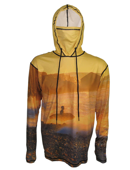 In this Frank D'Agostino photo Golden Surfer captures the anticipation of an eastern surfer looking for the first wave of the day. Our surf and dive beach apparel works great for sun protection on the ocean as well as hiking clothes on the trail or on the river. Great sun protection, moisture wicking apparel. An internal neck gaiter built into the hood is included for additional sun protection.