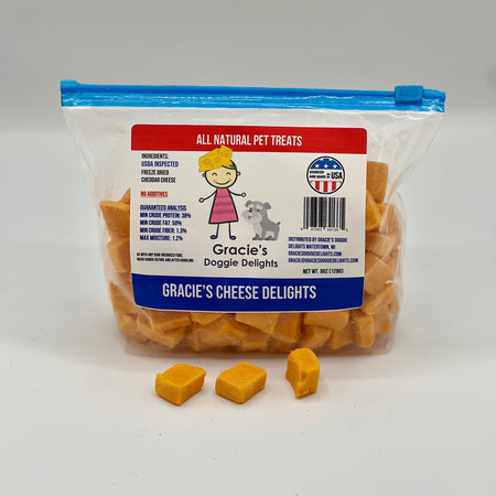 A half pound bag of 100% Wisconsin Cheese. These dog treats are Freeze Dried, so there is no need to refrigerate. Your dogs will love them! These treats were originally designed for hikers for a quick protein snack that didn't need to be kept cold. The cheese is freeze dried, so it is harder than cheese out of your fridge. Because of that these treats probably won’t work well for dogs with a lot of missing teeth.